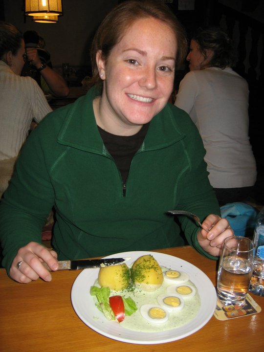 We arrived in Frankfurt late in the evening and really only had time for dinner before heading to bed– we had to get up early for our flight home. We walked along the river, which was nearly flooding, to an old square and found a little spot where we could get frankfurters as well as eggs in the infamous green sauce. I have to be honest– I didn’t love the green sauce!