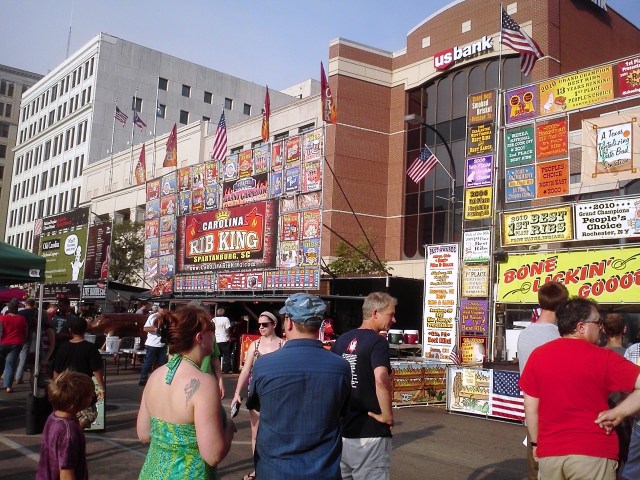 This was the annual Rib, White and Blue, Akron’s national rib festival, featuring almost a dozen award-winning BBQ stops from around the United States, including a handful from Ohio. We perused the competition and the fiance selected a brisket sandwich from one stand while I waited on the pulled pork from the Old Carolina BBQ stand.