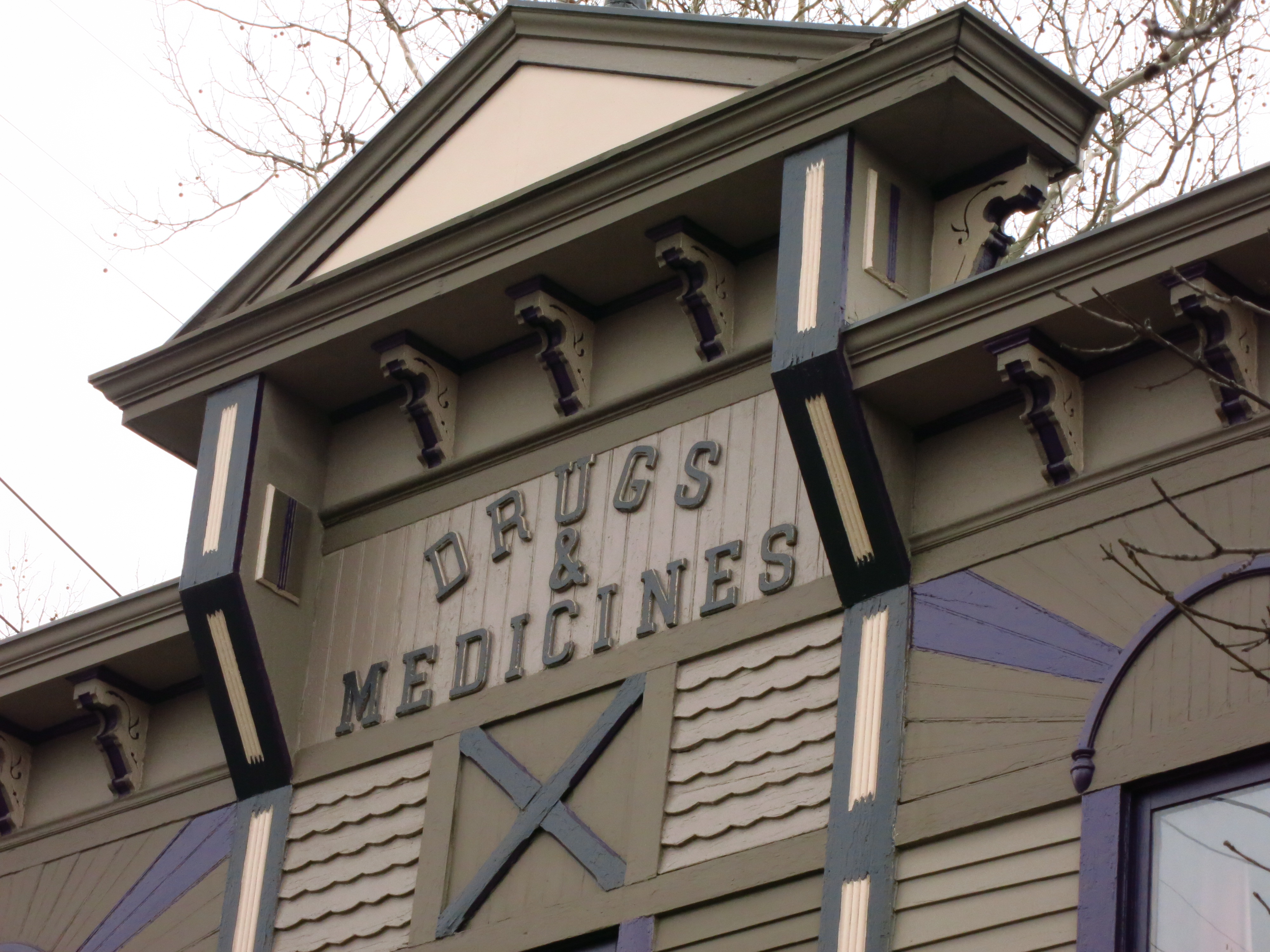 There are some amazing built-ins and old drawers from the drugstore days, along with a stamped ceiling. If they filled the empty shelves around the room with old apothecary items they could really have something.