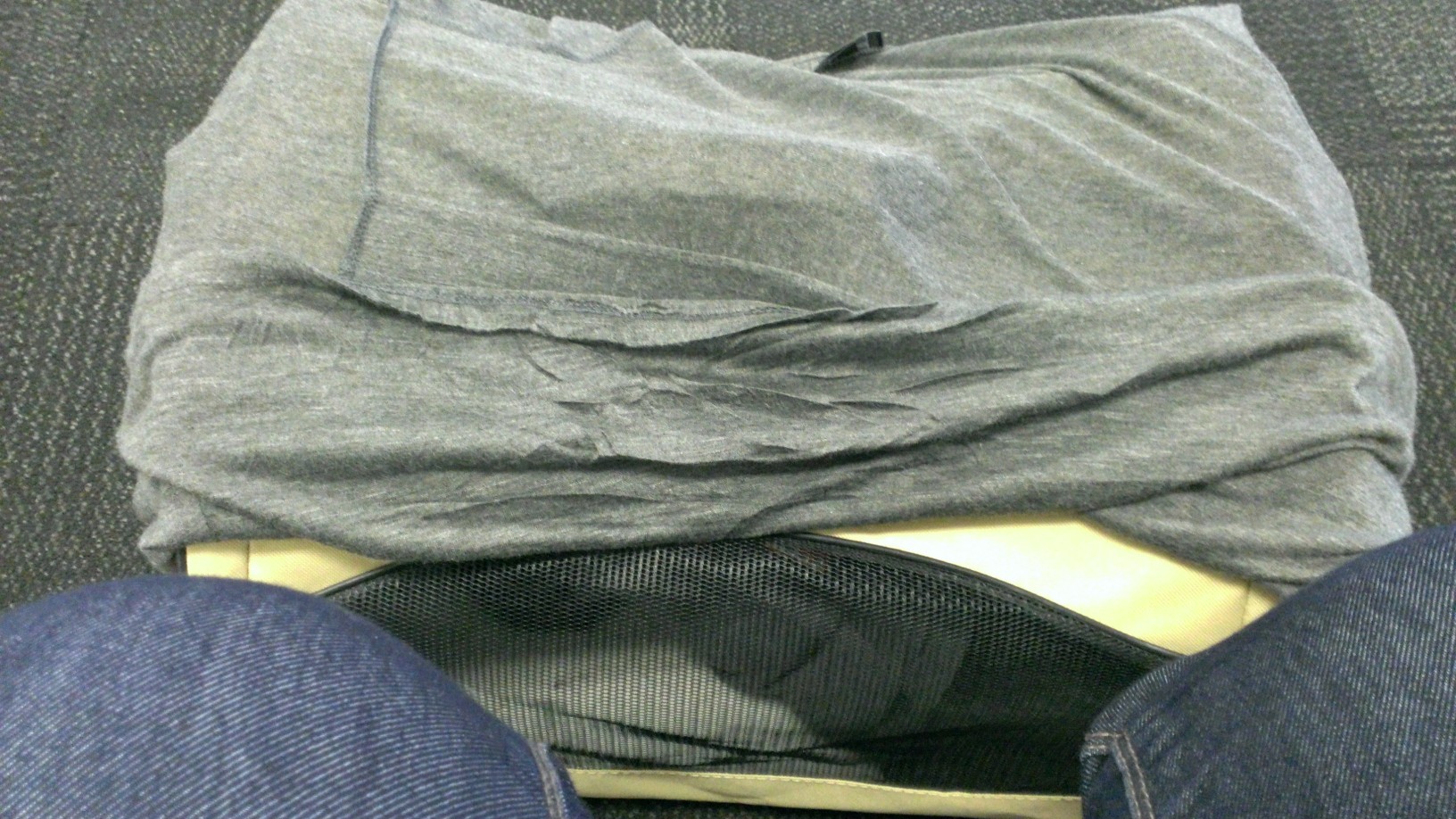 - Make Friends in Your Row. I paid for extra leg room on the flight (a $37 up charge that ended up being worth it, given how big he is). Unfortunately my aisle seat had a large gray bin under the seat ahead of me, which you can see in the picture to the right. It was all I could do to squeeze his carrier underneath, and I was having a mild panic attack thinking about him packed in there and uncomfortable for the next 4.5 hours. Thankfully the seat next to me was empty and an incredibly kind woman sitting in the window seat took an interest in Seppy and suggested we put him under the middle seat. It was SO much better. There was more room, and although I had to push down the top a bit, he had plenty of room to move around and was fine. He cried a little bit during take-off and landing, but he was completely quiet the rest of the flight.