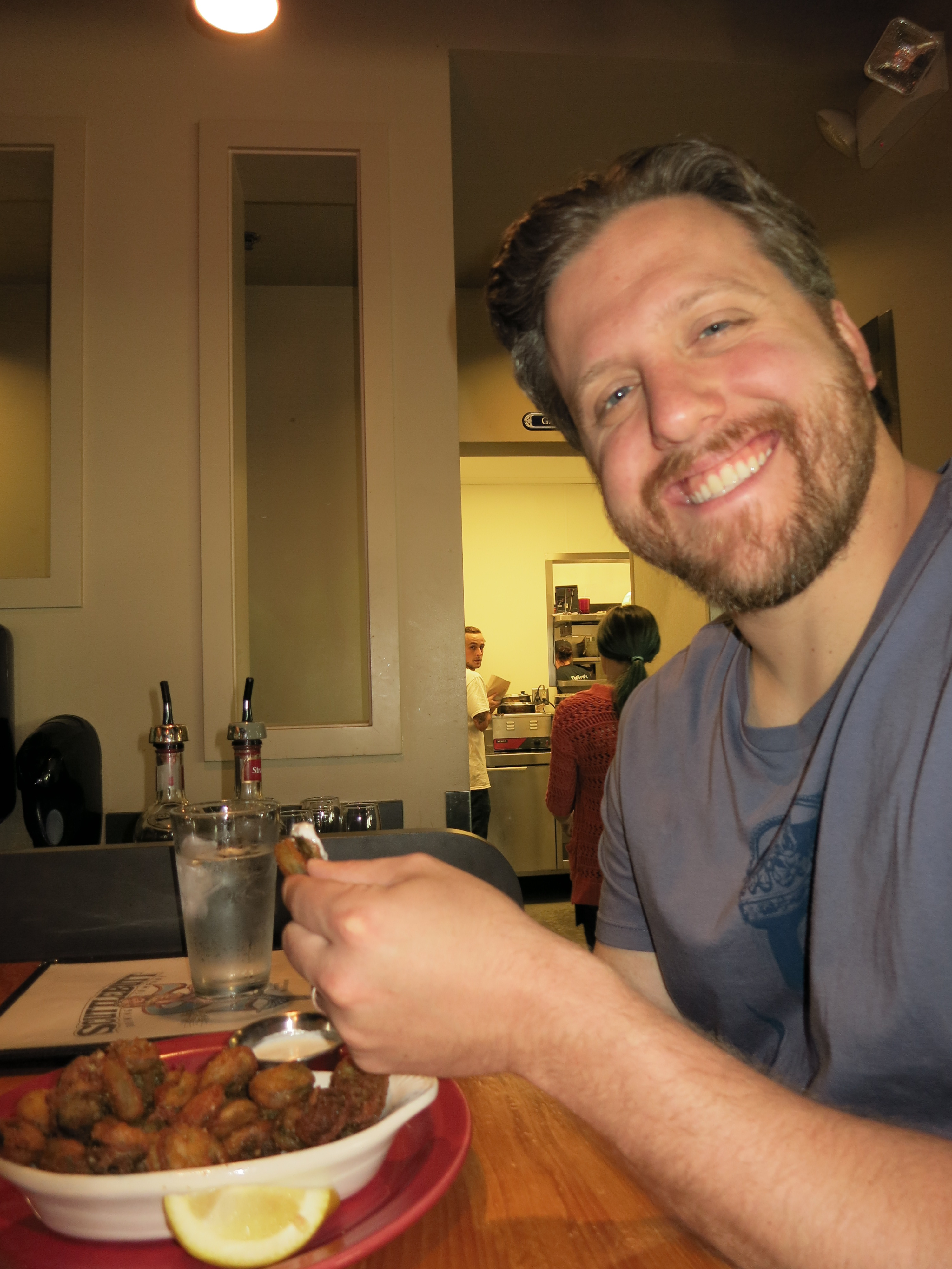 My husband was ECSTATIC when he discovered they had jalapeno bottlecaps, which he had only ever seen when he traveled in West Virginia during a previous job. They are round slices of jalapeno , lightly breaded and fried and served with ranch or a spicy dipping sauce. I love spicy food, and these things were addicting. We shared those along with toast points and a beer cheese dipping sauce.