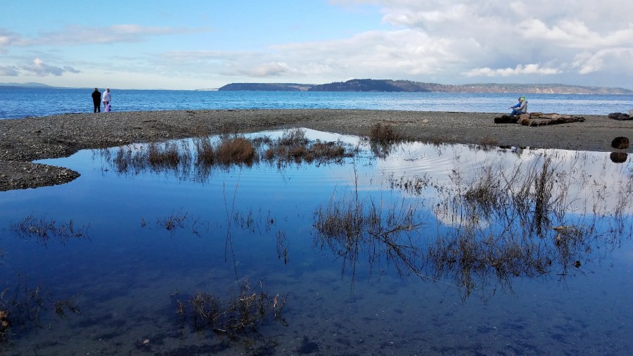 A number of people were already on the beach enjoying the day—some had their dogs, others had picnics, and one woman was working on some artwork. The sky was clear and blue to the north but gray and cloudy to the south—Brian took an awesome picture looking out over the water where you can clearly see the blue/gray divide reflected in the sound.
