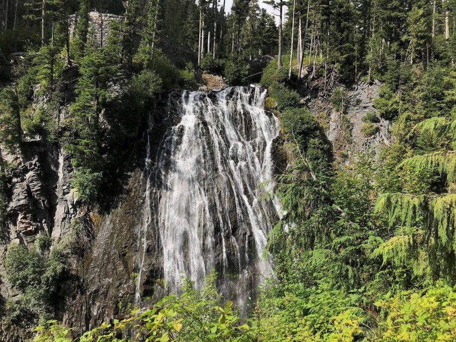They were right–the falls is just off the road between Paradise and Longmire, making it a popular spot. The parking lot was full and there were lots of people enjoying their lunches on the picnic tables near the walls overlooking the falls.