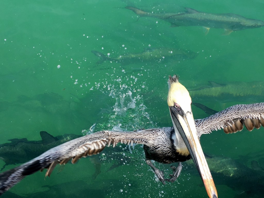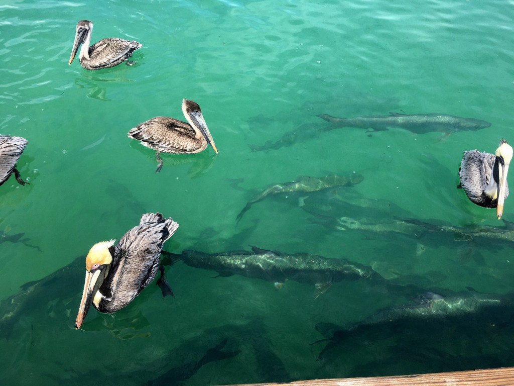 The anxiety builds as you watch the tarpon swimming back and forth under you, waiting for one to suddenly burst up through the water to grab your fish. The tarpon weren’t the only problem — there were pelicans EVERYWHERE and they became extremely aggressive, trying to steal fish from the buckets when you were least expecting it. The workers kept shouting for people to hold their buckets up in the air and walking around the docks, gently pushing the pelicans back into the water. We had one terrifying moment where a pelican charged Tanika, beaking her in the back of the leg, reaching around my hunched over frame, and stealing the fish I was holding in my hand before I even knew what had happened!