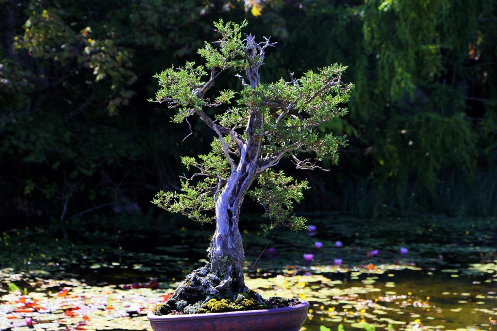 A tree planted in a small pot is not a bonsai until it has been pruned, shaped, and trained into the desired shape. Bonsai are kept small by careful control of the plant’s growing conditions. Only branches important to the bonsai’s overall design are allowed to remain and unwanted growth is pruned away. Roots are confined to a pot and are periodically clipped. Bonsai may have a stylized or an exaggerated form, but it is always reflective of the tree as found in nature. The appearance of old age is prized, and in fact, bonsai may live to be hundreds of years old. The living bonsai will change from season to season and from year to year requiring pruning and training throughout its lifetime. As time goes on, it will become more and more beautiful.
