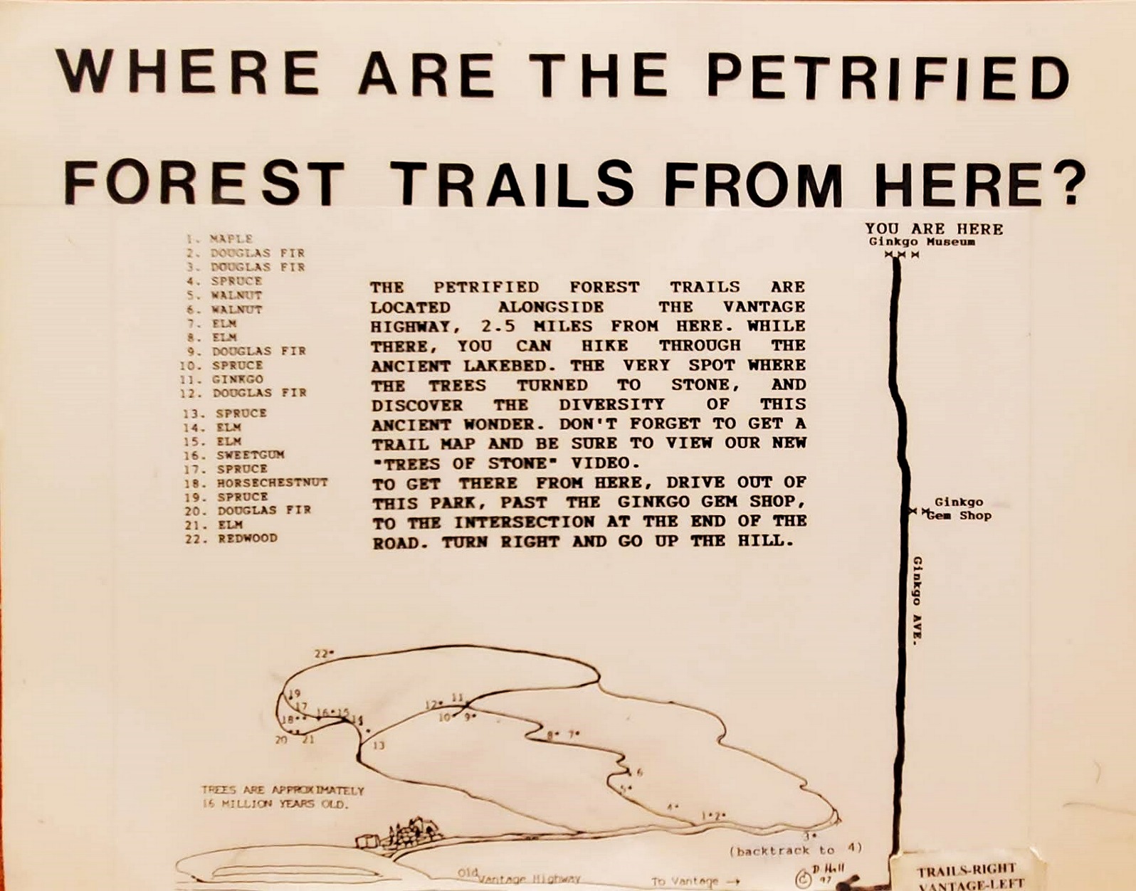 The trailhead for the Ginkgo Petrified Forest Interpretive Trail is only a couple miles away from the interpretive center, and I would recommend experiencing both the center and the park if you have time. While there’s a small room with informational plaques at the trailhead, the center has more detailed information as well as the polished petrified wood on display.