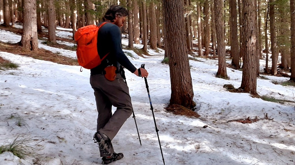 Once we reached the first viewpoint of the surrounding mountains, the trail turned to packed snow and ice. We were happy to have our ice cleats and trekking poles — it would have been very slow going from that point until we met up with the Wonderland trail if we hadn’t had the additional traction. This was my second time wearing the new cleats and Brian’s first time — his pair arrived in the mail a few days prior to our hike.