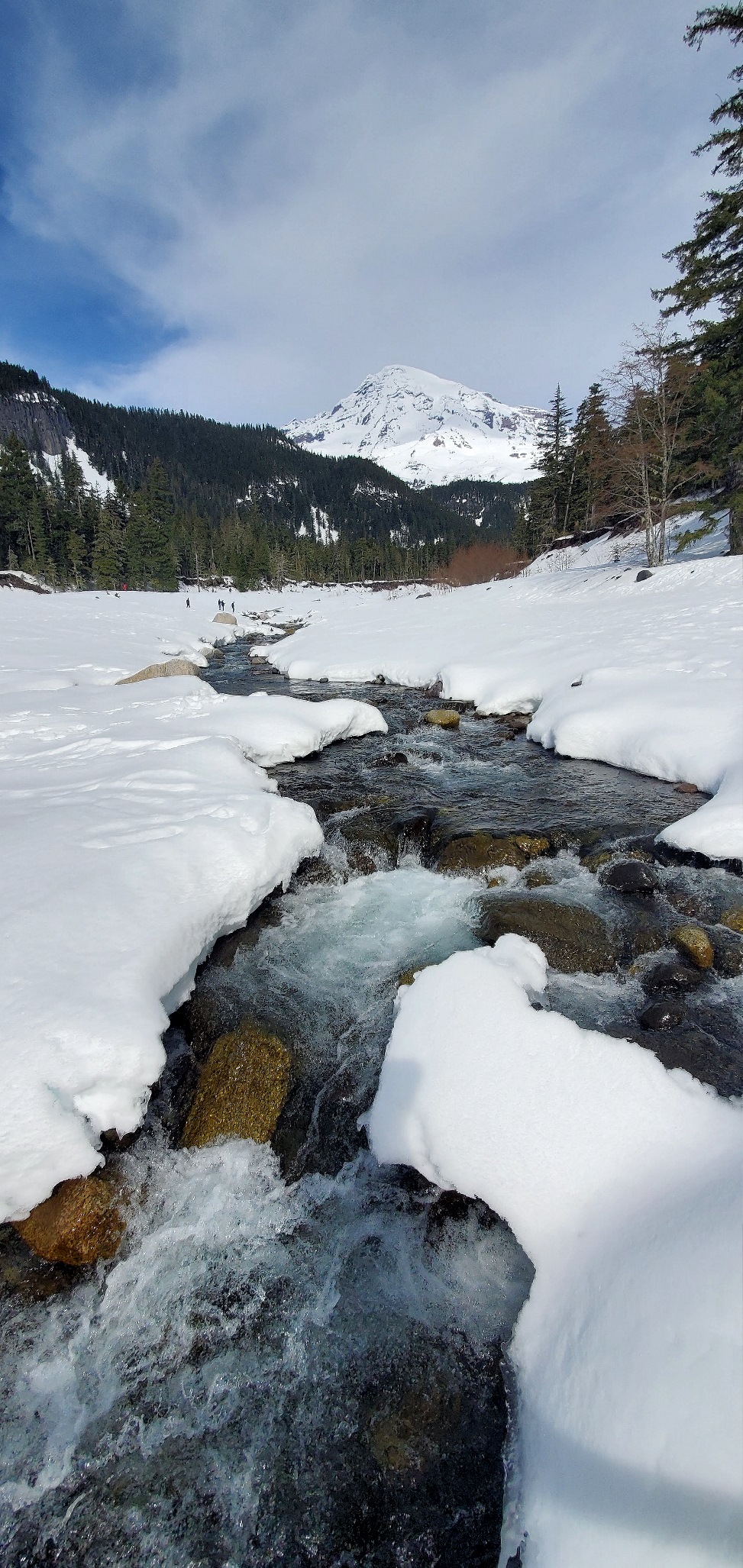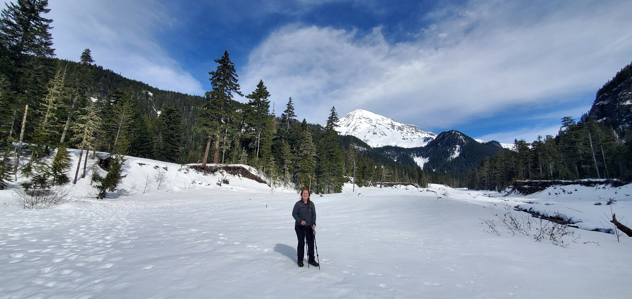 The clearing near the parking area for Carter Falls was busy on our hike back to Longmire — there were lots of people out enjoying the snow and the gorgeous views of the summit!