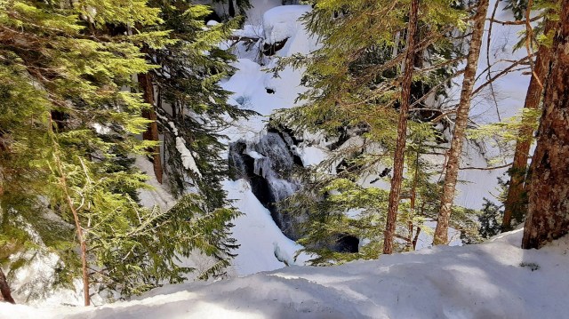 We crossed an open area and wooden bridge before making a modest climb to the viewpoints for the falls. They were a bit hard to see given the amount of snow and ice covering them right now, but we managed to catch some glimpses through the trees.