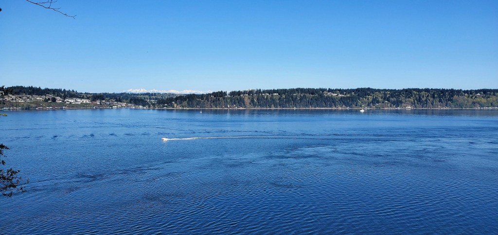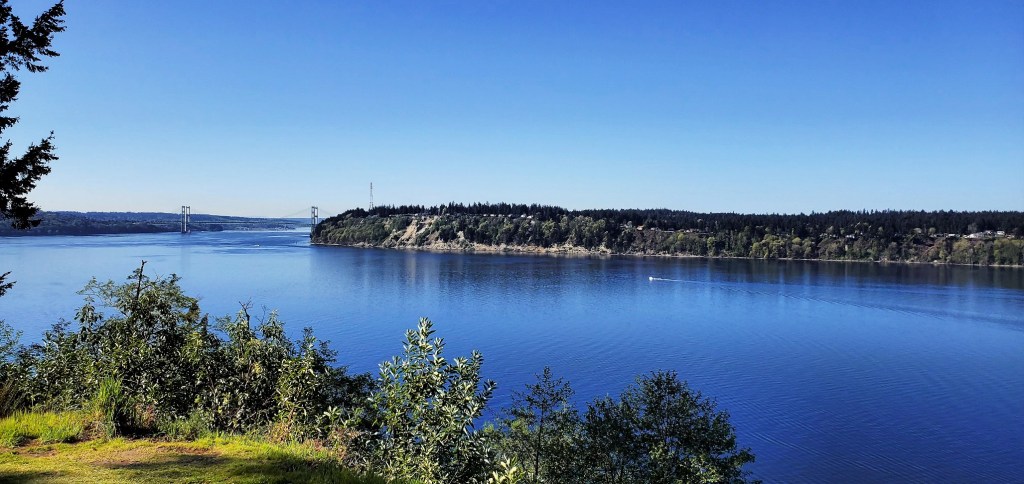 There were a lot of people walking, jogging, and biking the Five Mile Drive road, but thankfully the trail was less crowded and we could wind our way through the woods at our own pace. We stopped at the Bridges viewpoint and Narrows viewpoint before arriving at the Gig Harbor viewpoint, which has facilities, picnic areas and beautiful views of the Olympic Mountains.