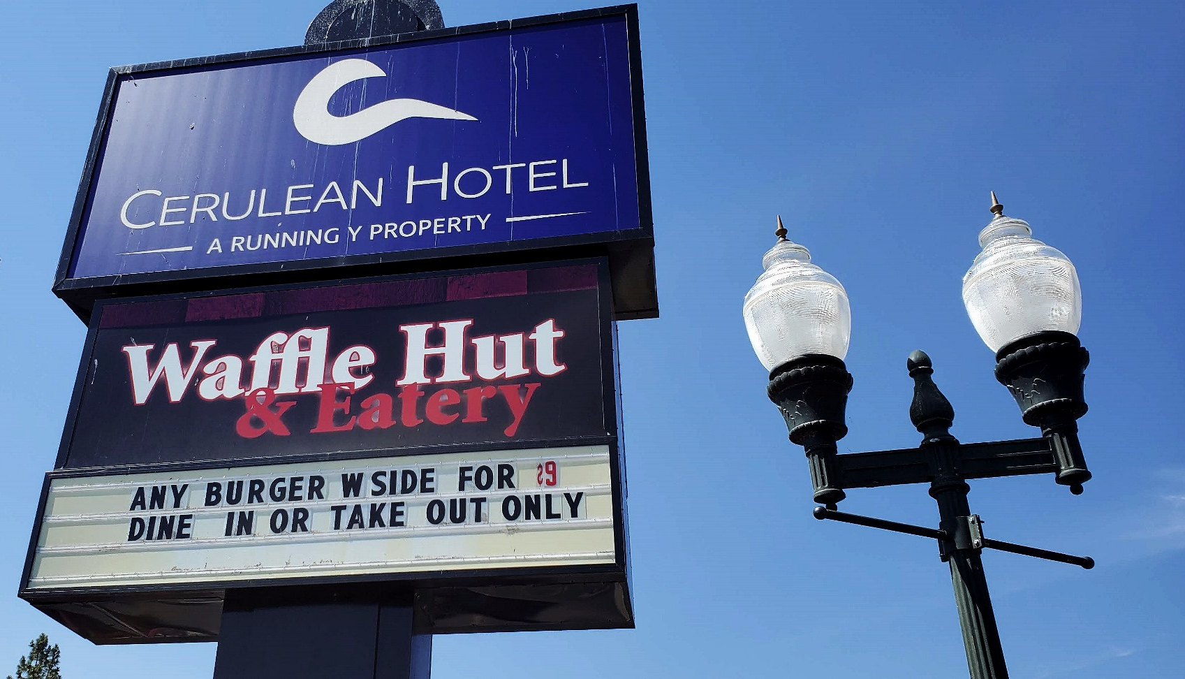 After a few hours of riding, we stopped for brunch at a place Brian found in Klamath Falls called the Waffle Hut & Eatery. We had a bit of an adventure navigating the one-way streets to park outside this spot, which is attached to a small hotel, only to discover people in folding chairs along the road. It was Independence Day morning, and we were parked along a street that was part of the town’s parade route!