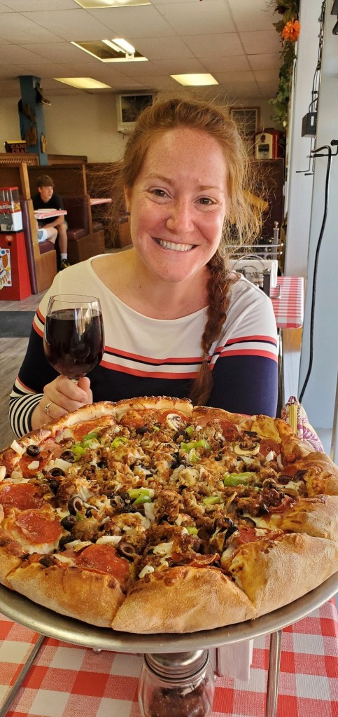 The woman working was extremely nice and quickly had us sitting in the front window with a steaming hot pizza and generously poured beverages. It was a long, hot ride, but we were thrilled to make it to California and to end our Independence Day on such a high note! Cheers!