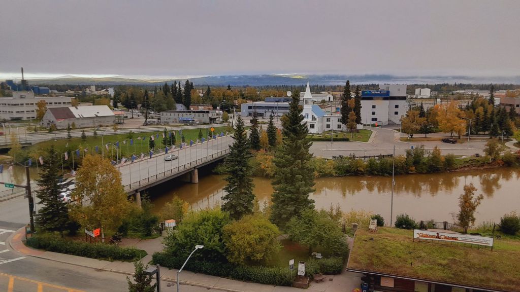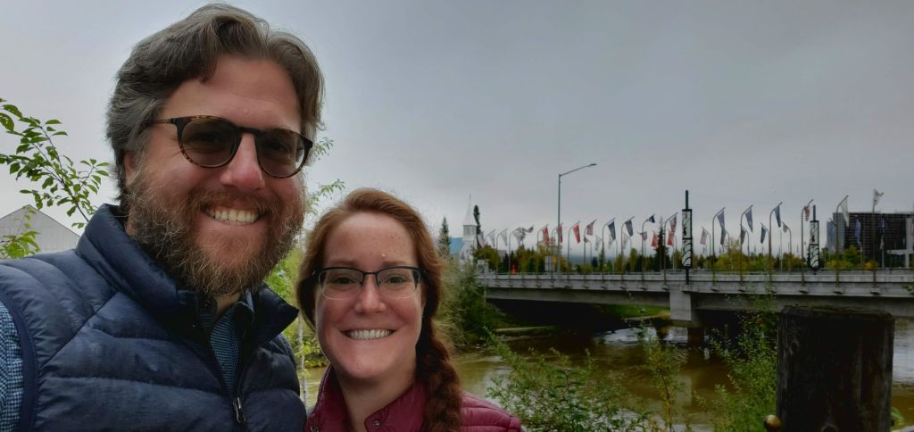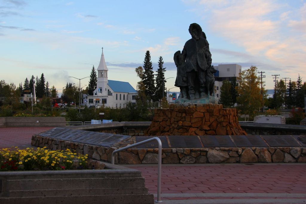 Walk along the Chena River. We stayed across the street from the Golden Heart Plaza in downtown Fairbanks, a few steps from the Barnette and Cushman street flag-lined bridges. We had lovely views of the Chena River and Immaculate Conception Catholic Parish from our hotel window. The night we arrived there were quite a few people experiencing homelessness in the park, but in the morning we had the place almost to ourselves.