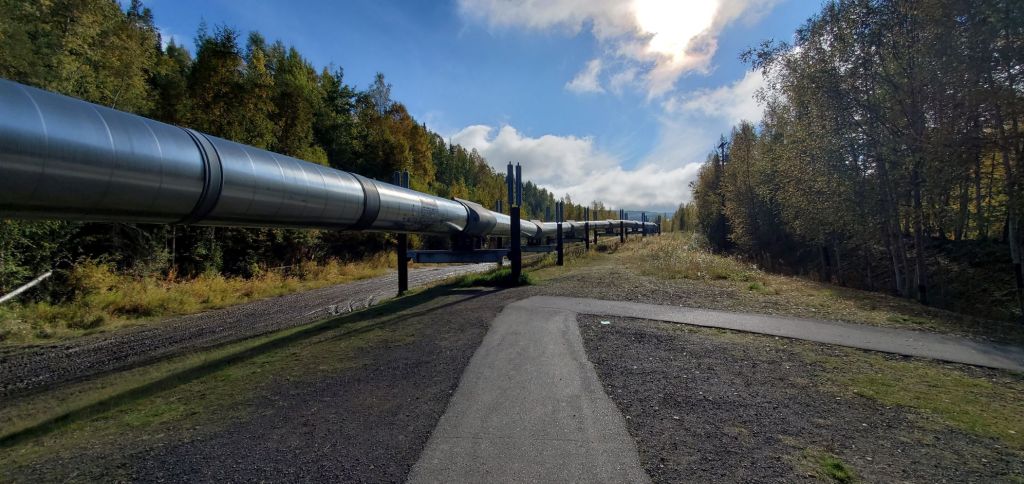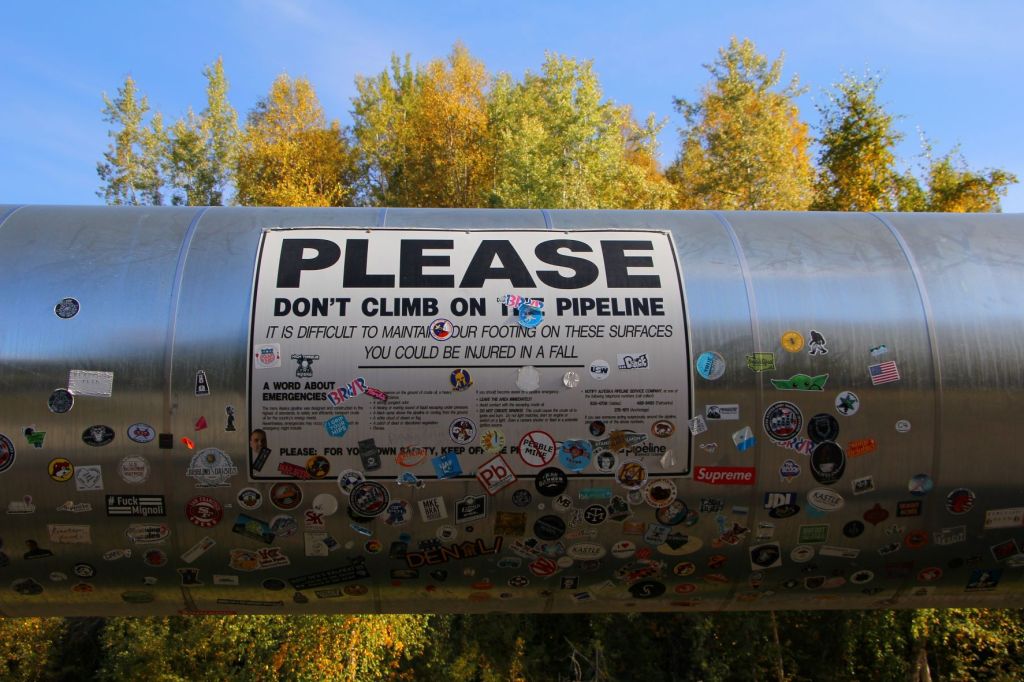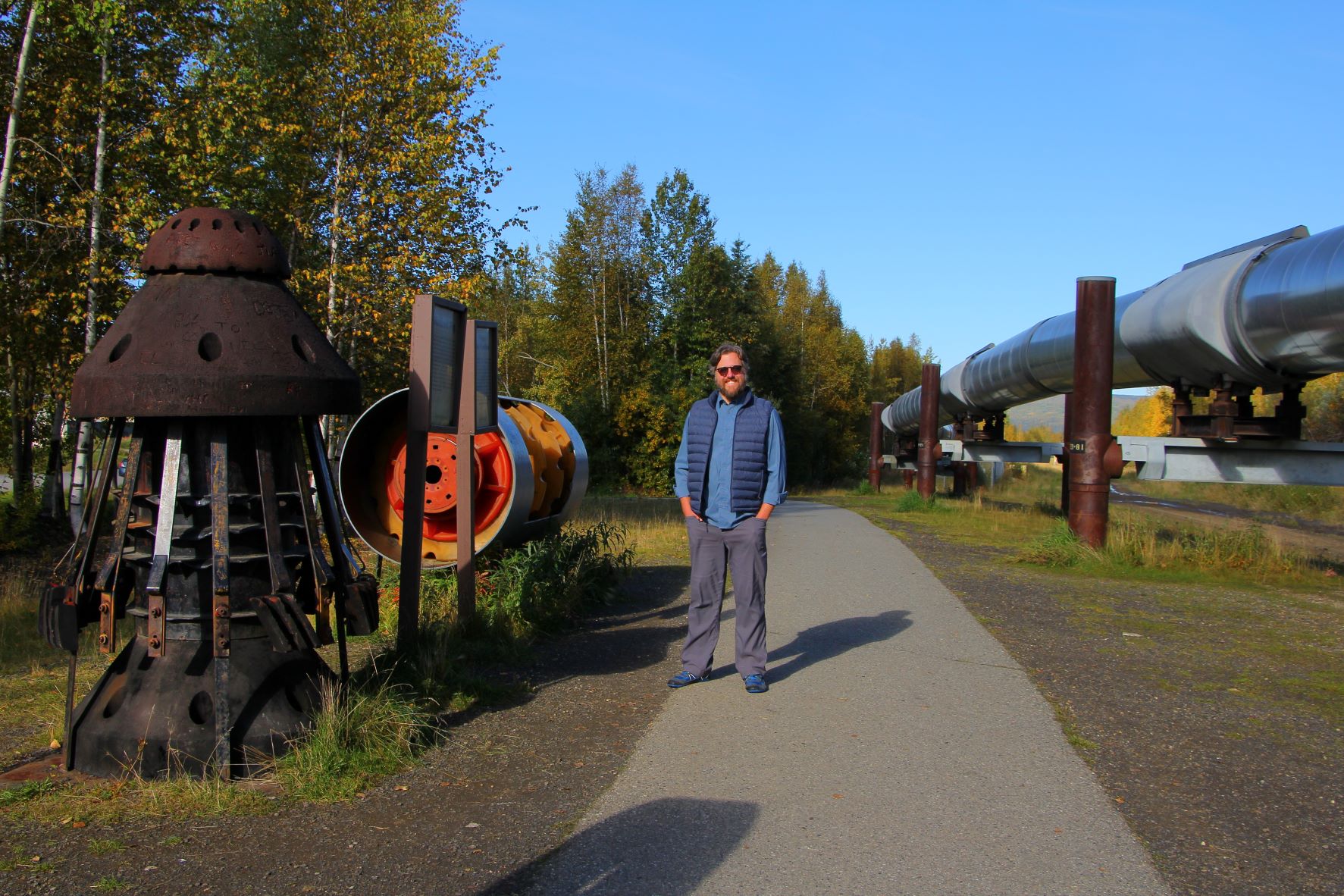 Drive to the Trans-Alaska Pipeline Viewpoint. After we checked out of our hotel, we happened to do a quick look at some of the other sites we had tagged around Fairbanks and noticed there was an Alaska Pipeline Viewpoint only 15 minutes north of town. This quick drive took us out of the relatively cloudy downtown up into the blue sky hills outside of town.