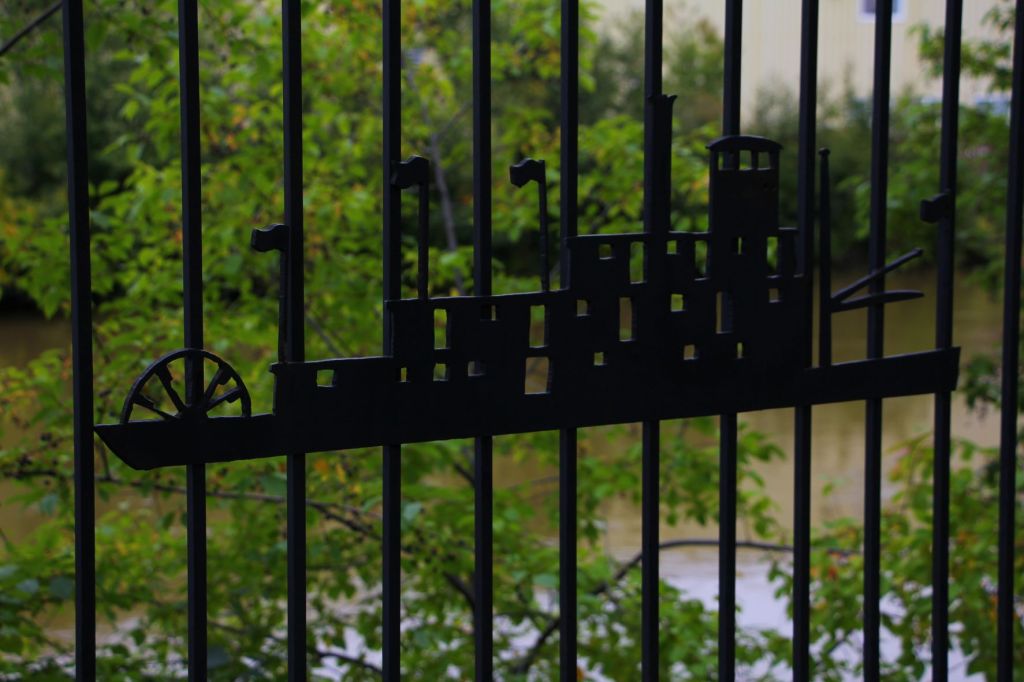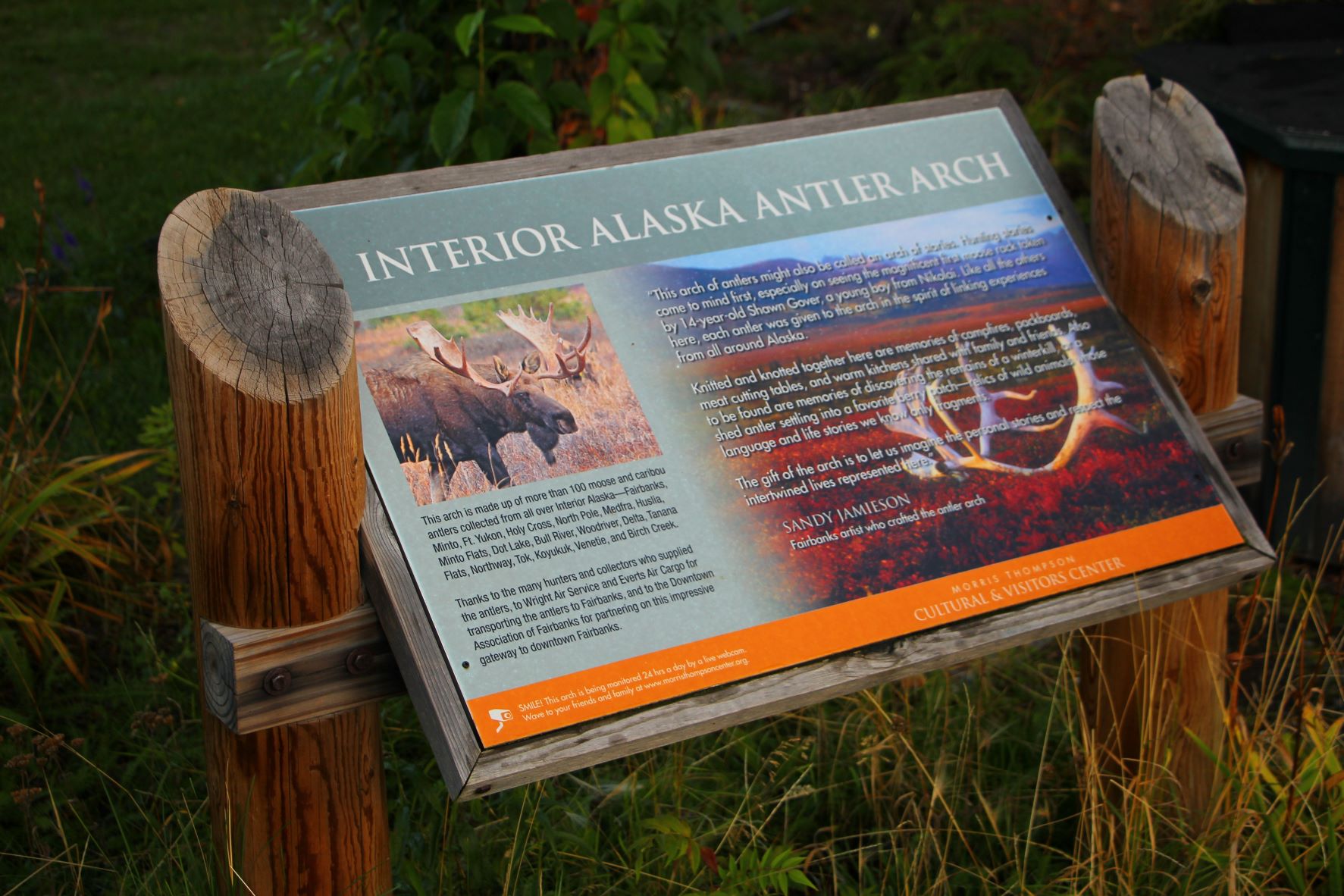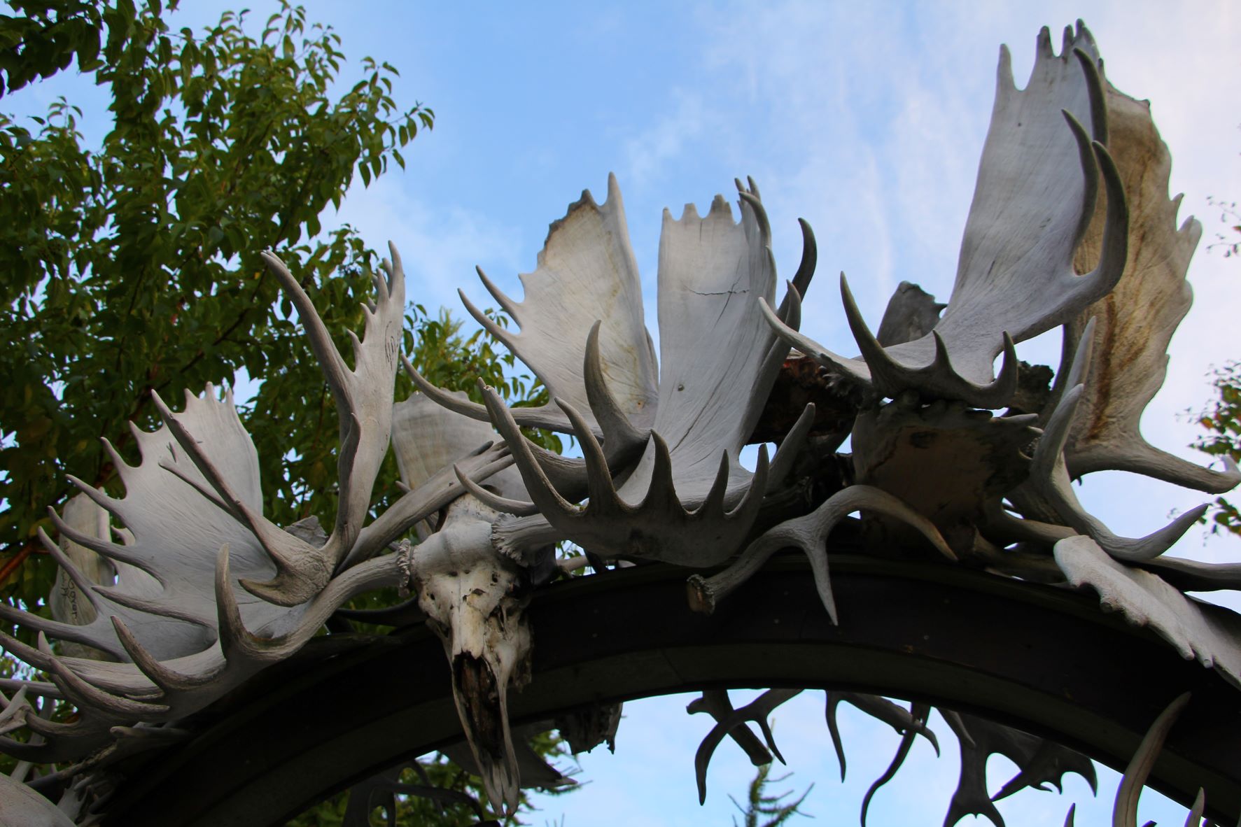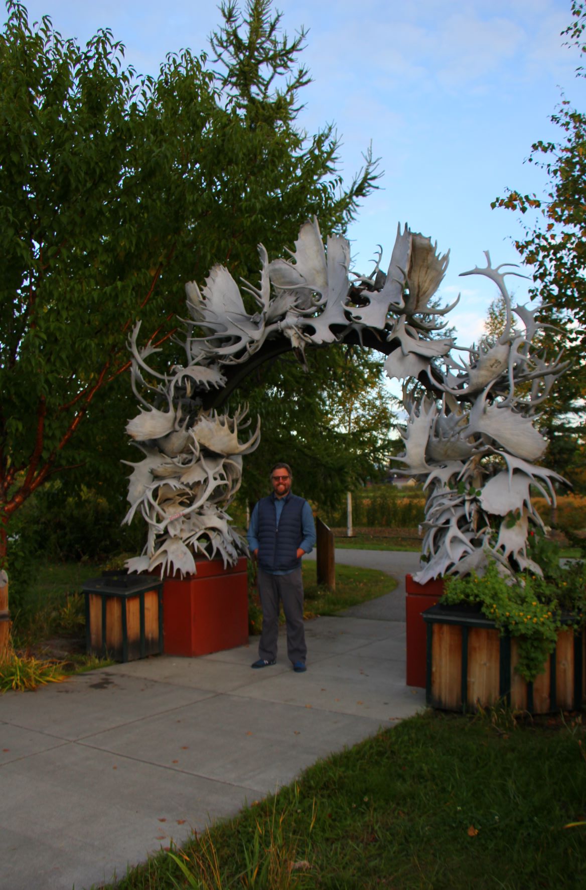 We walked the path along the river, first toward the east and the Alaska Antler Arch at the Morris Thompson Cultural Visitor Center. Made of 100 moose and caribou antlers donated by hunters throughout the interior, this installation was one of Brian’s Roadside America finds and pretty interesting to see.