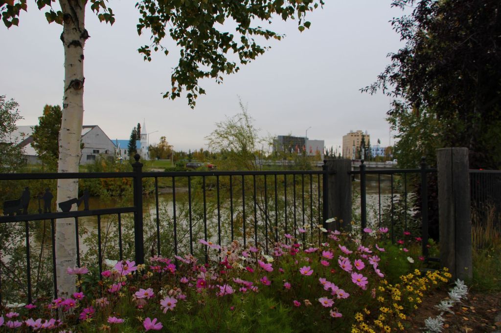 Later we walked the path west past the bridges. The western walk included several information plaques featuring Fairbanks history, including how the area quickly evolved during the early days of the Gold Rush. There were some beautiful flower beds still in bloom and older buildings along the street to admire, and a number of people were out running and walking their dogs.