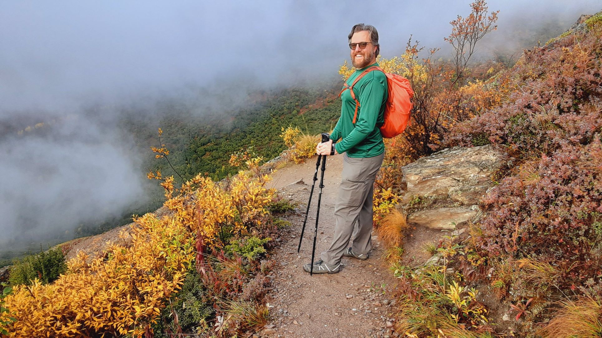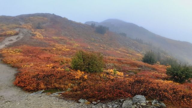 We hiked a bit beyond the overlook, but the cloud cover continued so our views were limited to the yardage immediately around us. That was very pretty in and of itself given all of the colors, but we didn’t linger long before making our descent.