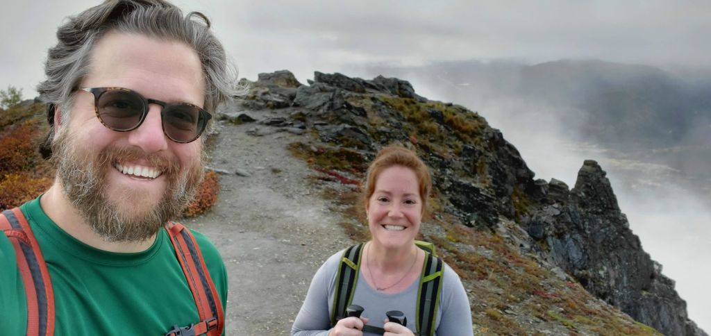 There was a sign clearly marking the overlook and the end of the maintained trail. We had read that it was possible to hike the ridges beyond but that it could be windy and dangerous – that was not the case while we were there. It was cool and cloudy, but there was no wind and there was a pretty well defined, if not maintained, trail.