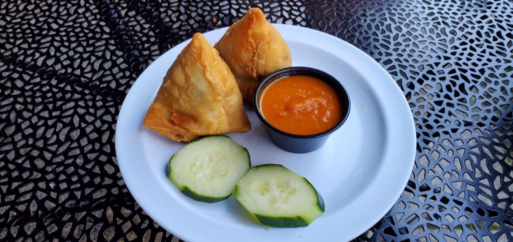We started with vegetable samosa – small crisp patties filled with peas, potatoes, onions and Himalayan spices – YUM! This bite-sized appetizer ended up being one of my favorite dishes, and we were battling over the homemade tomato and sesame sauce that accompanied it.
