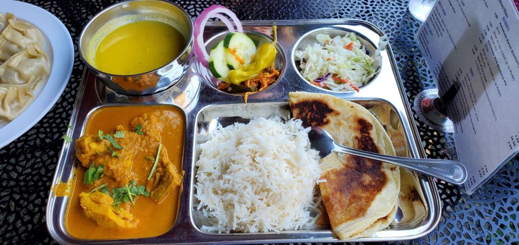 Last but not least, we shared the thali – a dish that gets its name from the literal dish, or thali, it is served in. This traditional Nepali platter came with chicken curry (there were other curry options, but that’s the one we chose), jasmine rice, lentil soup, pickled vegetables, coleslaw, and roti – a Nepali flatbread. Everything was amazing, but Brian was particularly obsessed with the flatbread, which I think was his favorite part of the entire meal!