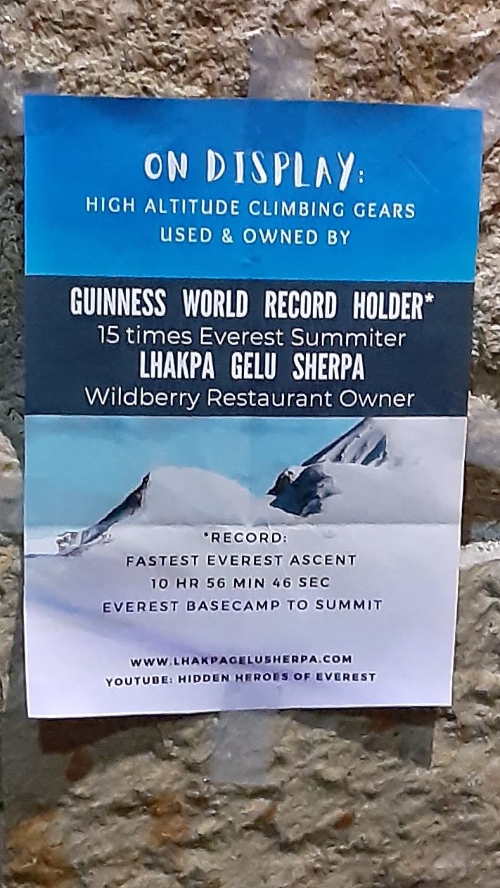 As it turns out, the restaurant is owned by Lhakpa Gelu Sherpa who set a Guinness World Record for the fastest ascent of Mt. Everest on May 26, 2003 – having climbed from basecamp to summit in 10 hours, 56 minutes and 46 seconds. The exhibit included the climbing outfit he wore on that ascent. In total, he’s summitted Mt. Everest 15 times (!!).
