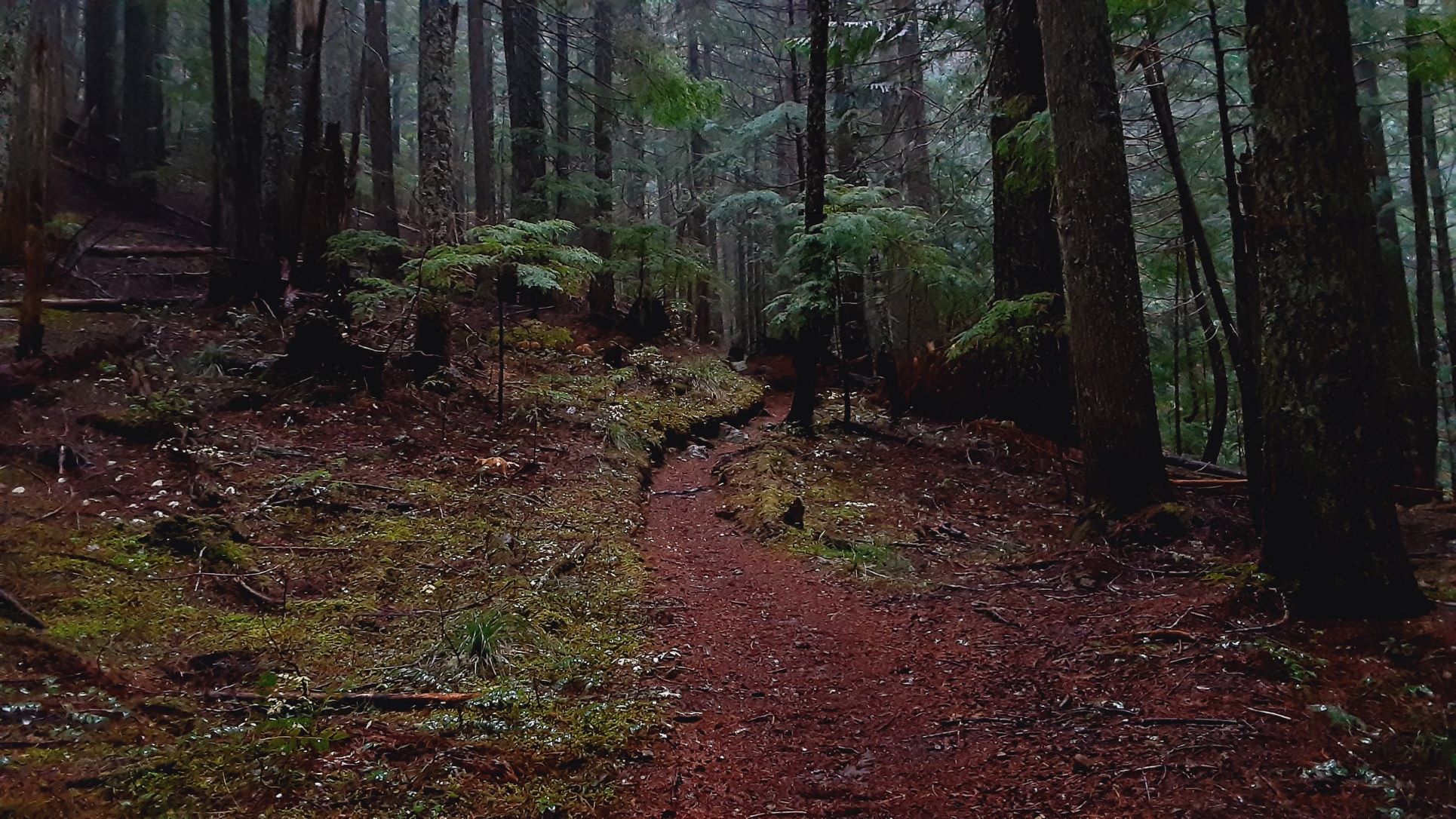 It was rainy and cold but we had the forest to ourselves. The trail was in great condition and we were surrounded by fall foliage as we made our way through some newer forest and boulder-filled creek beds.