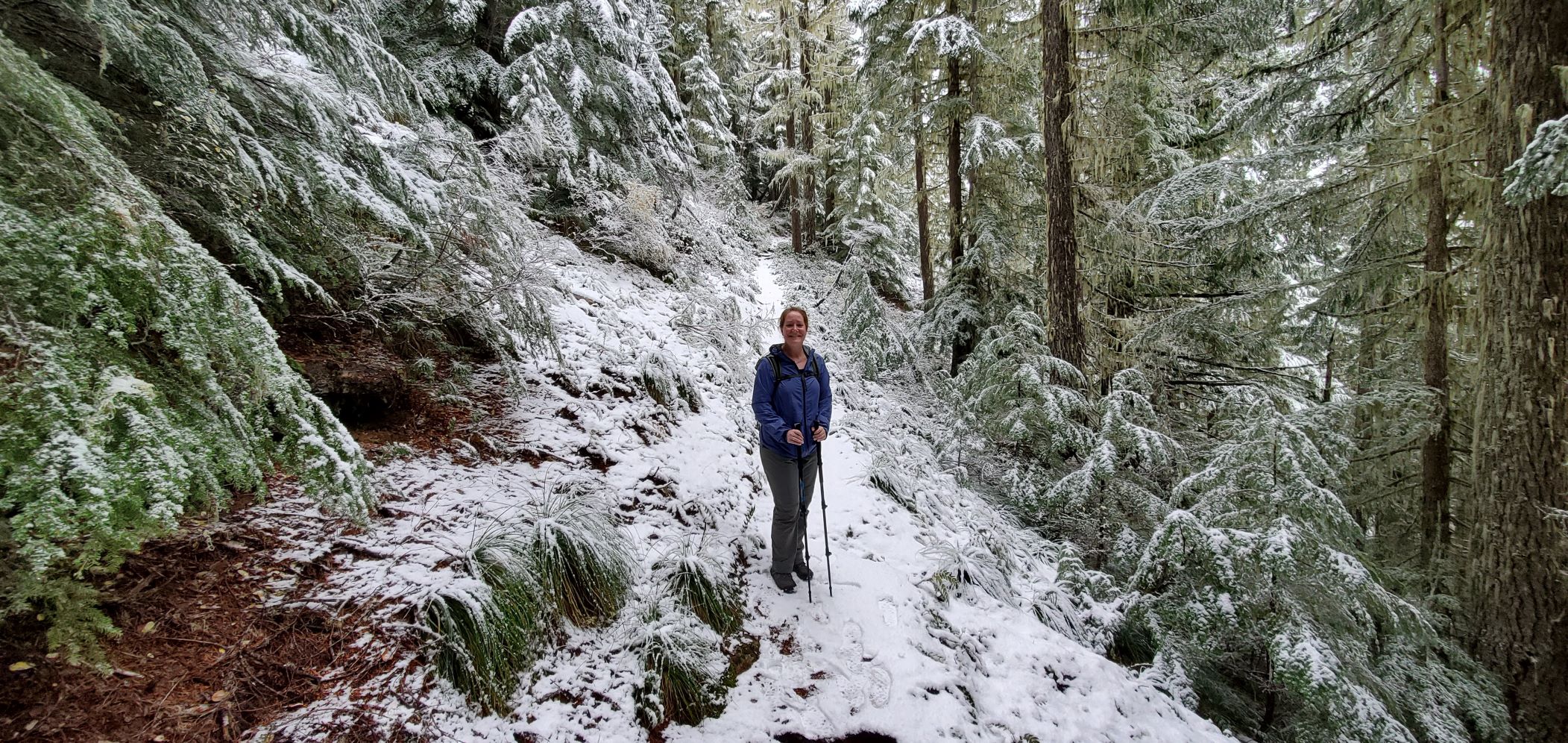 I was glad we had our trekking poles but we never ended up pulling on the ice trekkers we packed – our regular trail shoes were fine as far as we went.