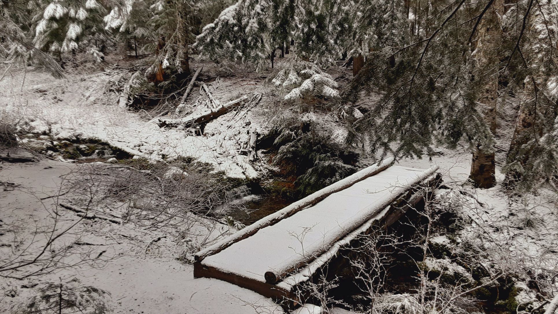 It was a lovely, peaceful hike with big, soft, quiet snow steadily falling between the tree branches. We stopped on a couple of occasions to just look up and watch the big flakes coming down. About half-way through our hike we came to a snowy bridge with views of some small waterfalls. I loved how bright and neon green the moss looked in contrast to the quickly accumulating snow.