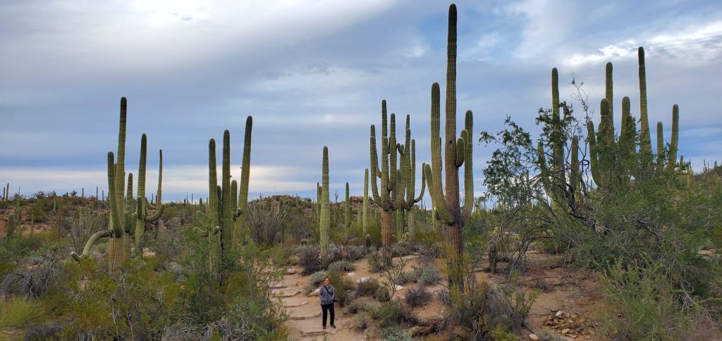 We lucked into a parking spot at the Valley View Overlook trail, an easy .8-mile roundtrip walk through various kinds of cacti with awesome views of the surrounding mountains and desert. Not far into our walk, Brian found a great spot for me to serve as a scale point for the towering saguaro!