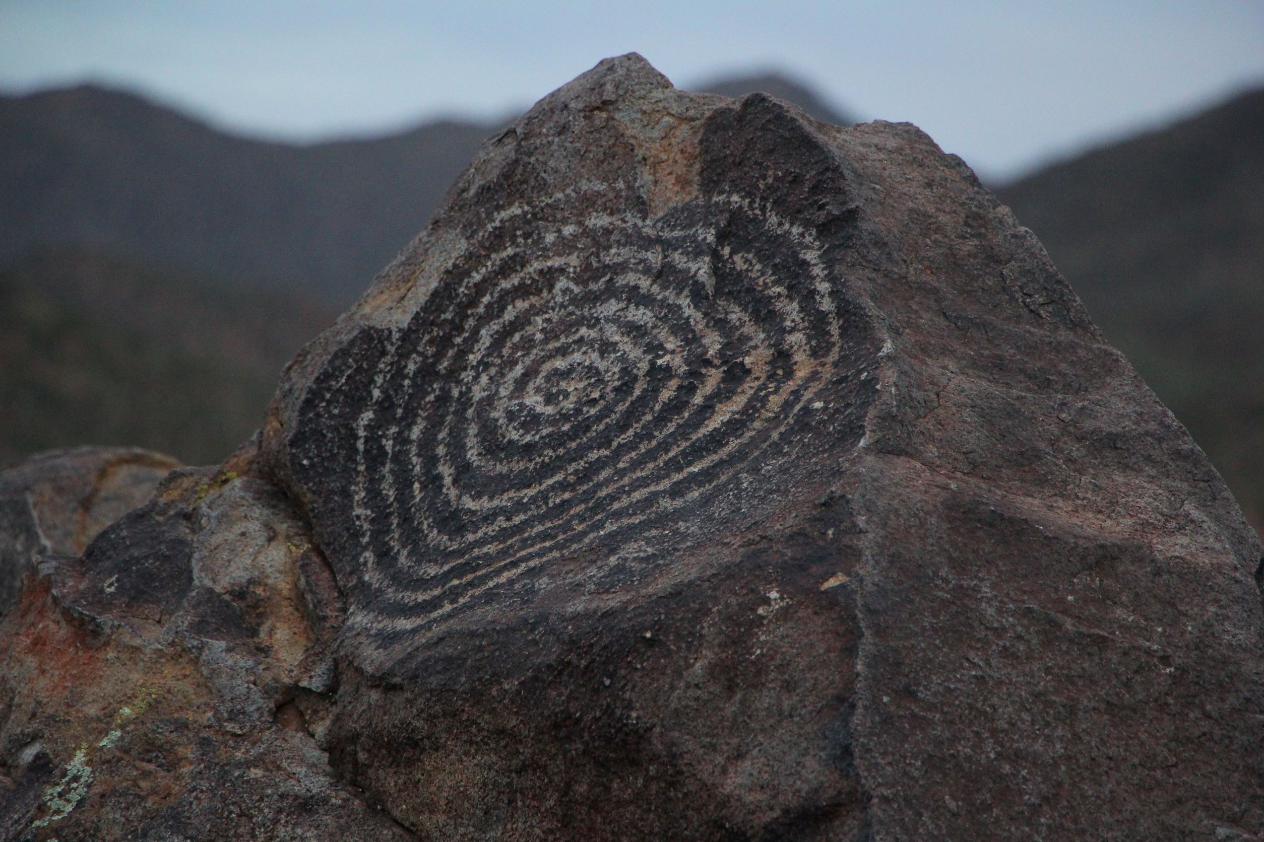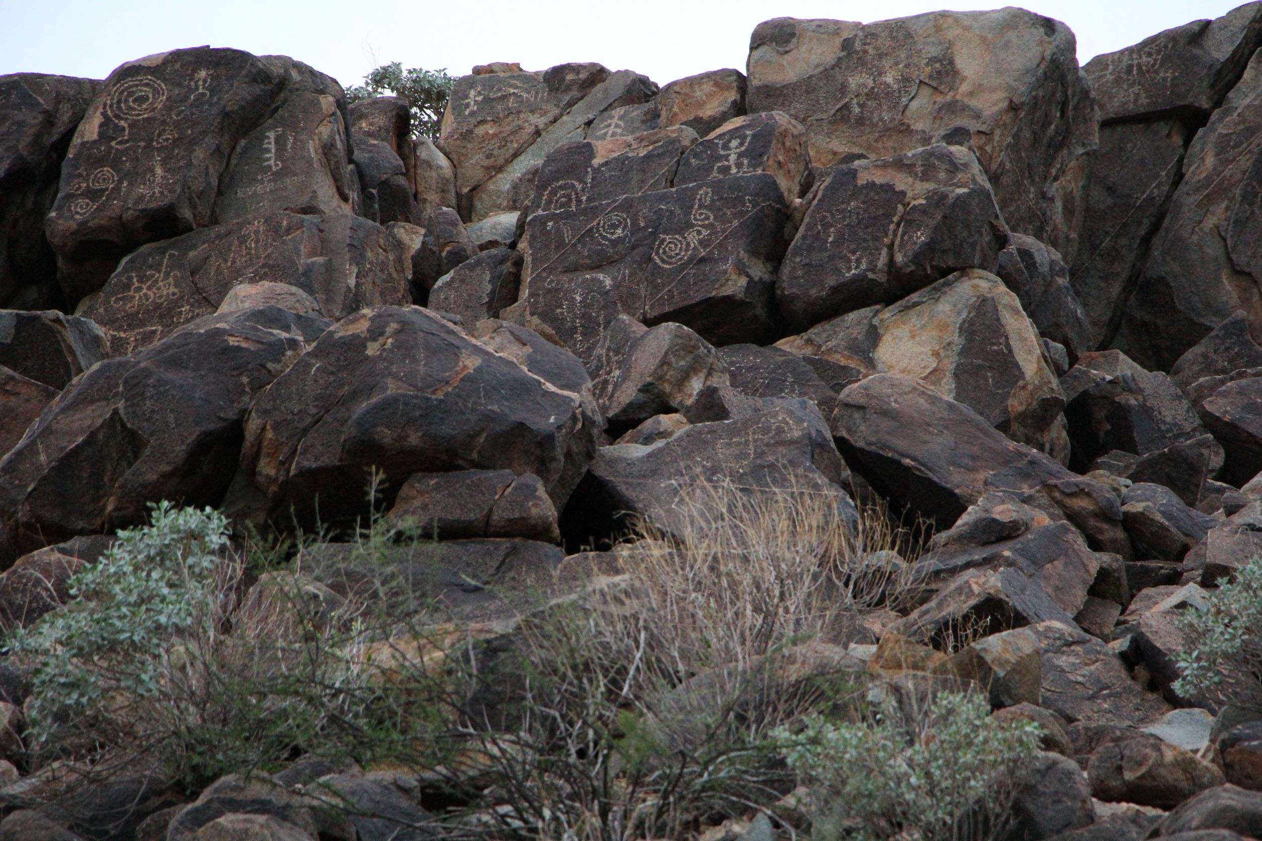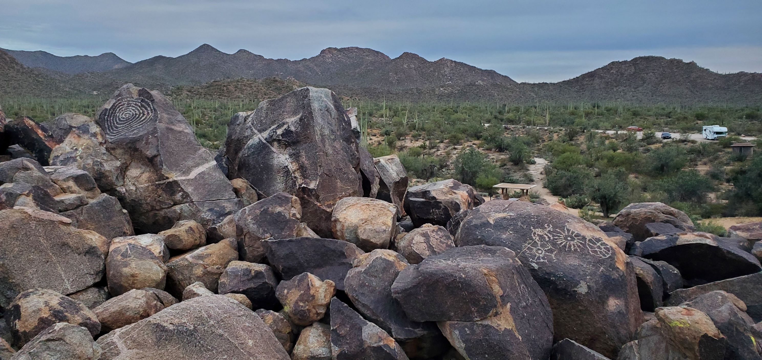 According to our park brochure, these rock etchings date from the Hohokam period (450-1450 CE) when people of the Hohokam culture gathered, hunted food, and devised irrigation systems for farming in this area. Brian was convinced the spiraling circles were meant to serve as warnings about snakes (thankfully, we didn’t encounter any rattlesnakes this trip)!