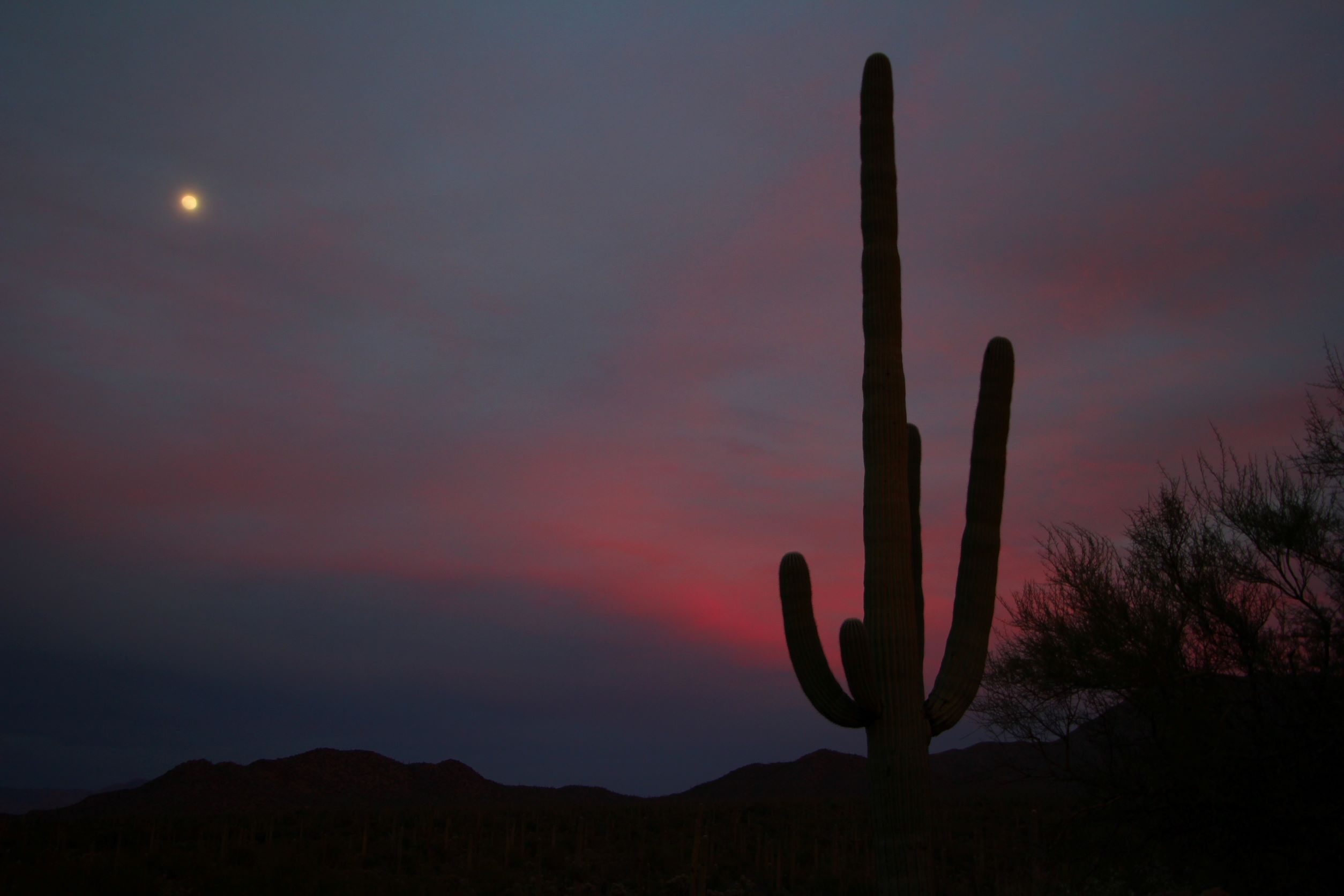 We ended up witnessing a fantastic sunset – bright reds, oranges and golds that smeared across the sky in every direction, including behind us. A few other people joined us on Signal Hill for the show, but Brian really wanted to see if he could find a saguaro to profile in the setting sun so we set off along the Desert Winds Trail.
