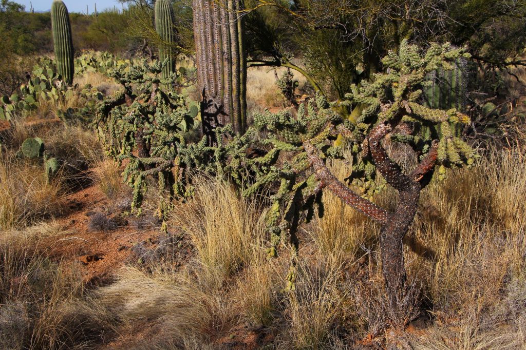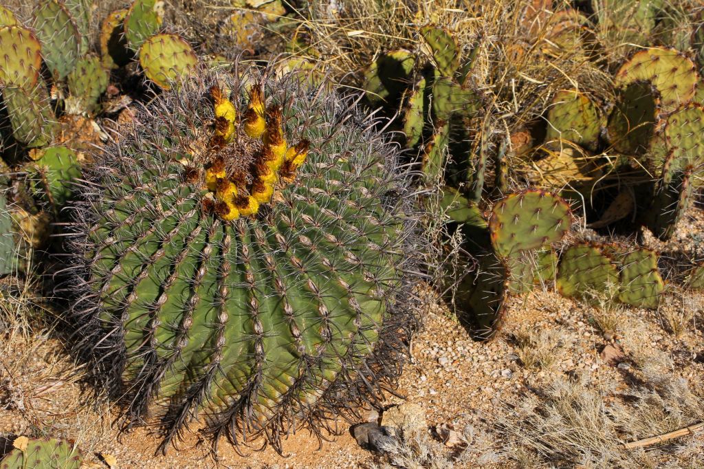 We encountered a few other people during our hike, including a group on horseback. I really enjoyed the diversity of cacti in this area, especially the fishhook barrel cacti and – my favorites! – the chainfruit cholla cacti, both pictured below.
