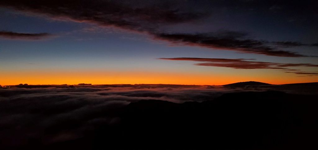 The morning of our experience, we left our AirBnB in Kihei at 3:30 a.m. for a very dark and quiet drive into the park and up to the summit. The farther we traveled from civilization below, the brighter the stars appeared overhead. As we wound our way up the volcano, additional cars joined our journey – a string of headlights weaving back and forth like Christmas lights across a tree.