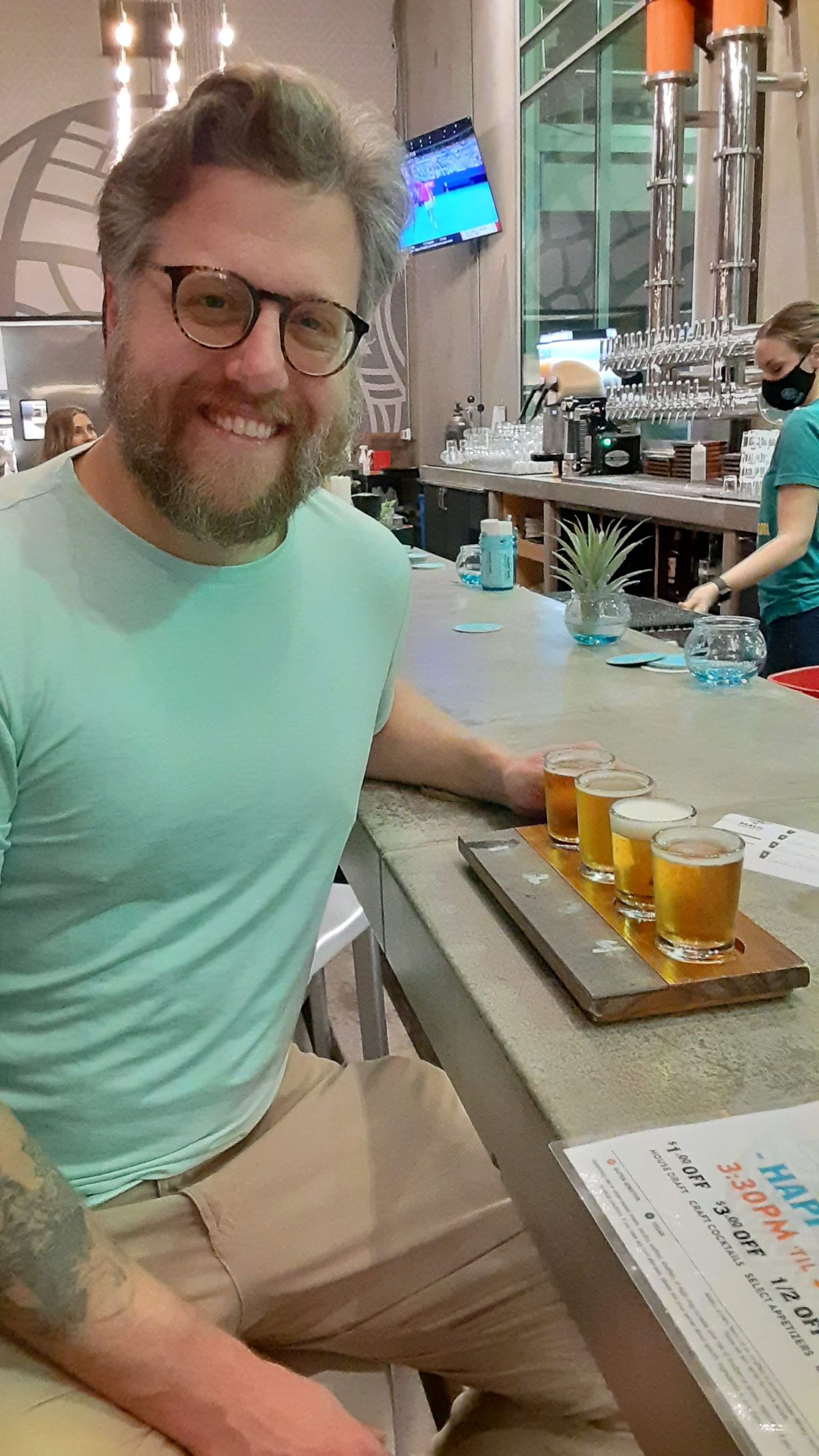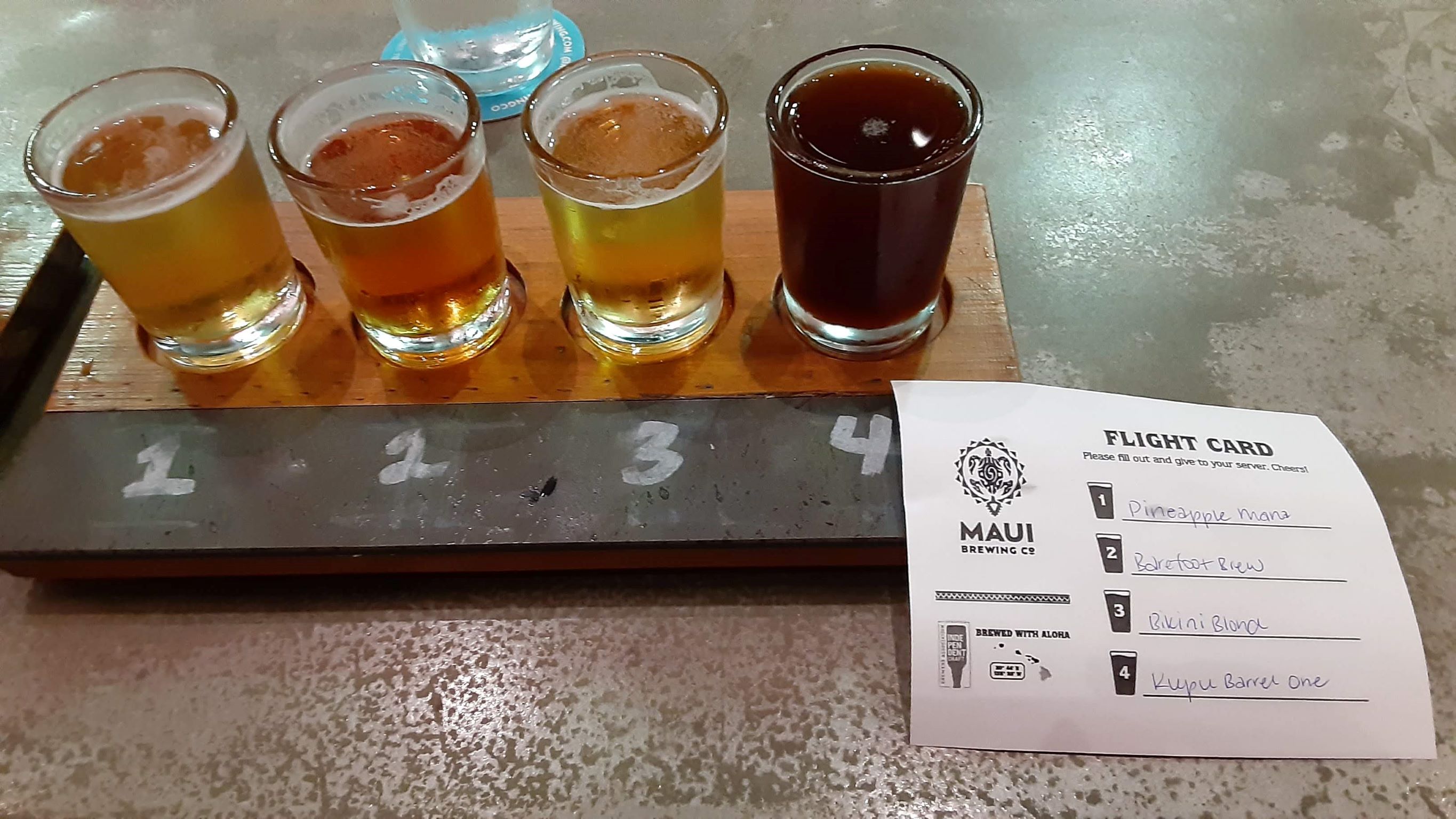 We were thrilled to see they offered beer samplers so we could each pick a few to try. I really liked the Pineapple Mana wheat beer and the Kupu Barrel One, which was an ale aged in whiskey barrels. Brian enjoyed two IPAs called the Vets are Sexy (West Coast IPA) and Mosaic Mo’ Betta (Double IPA).