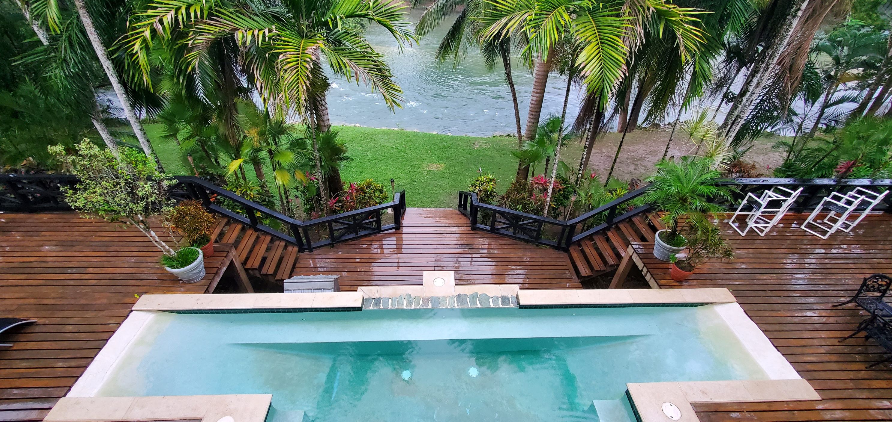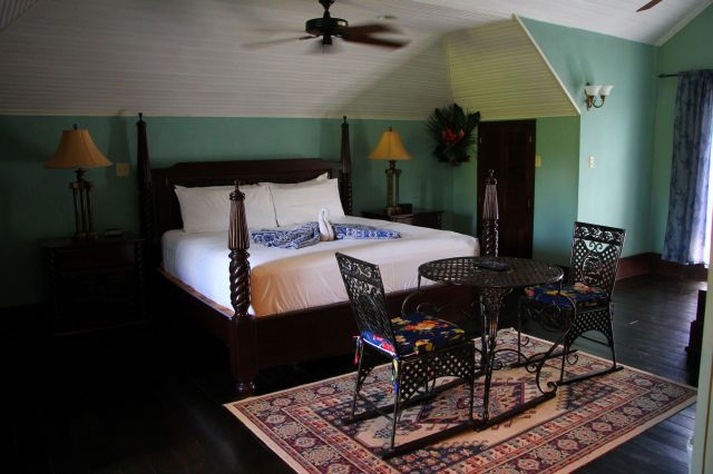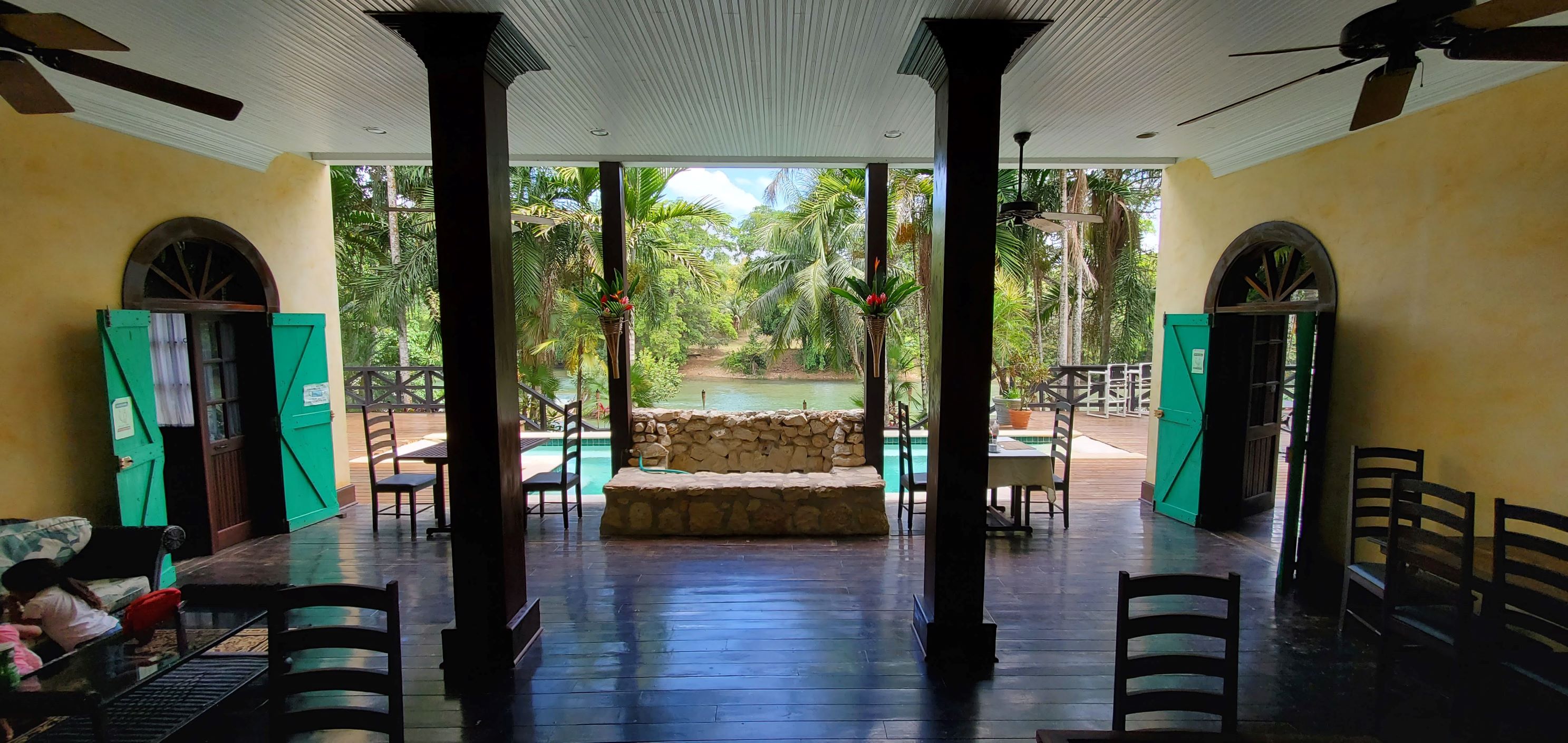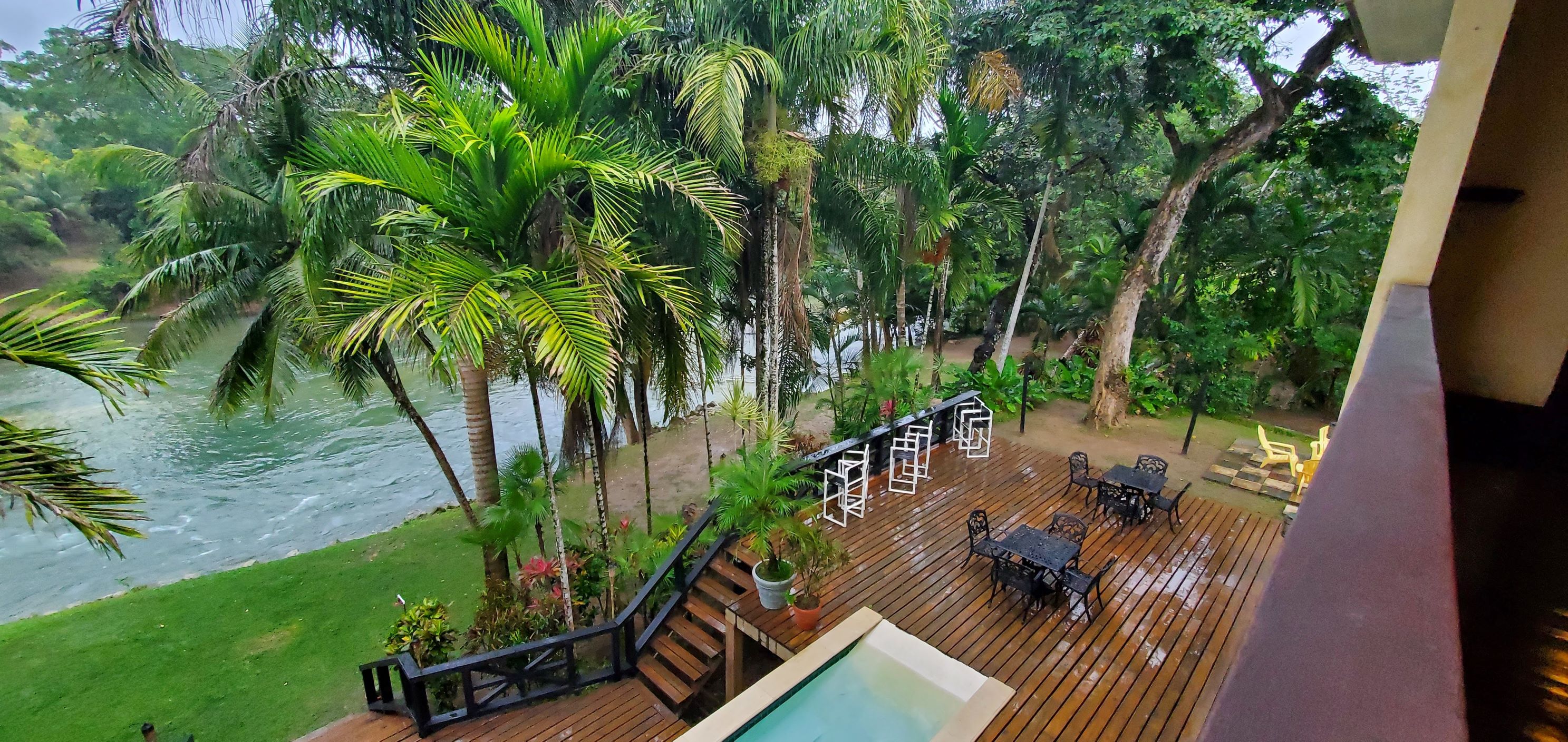 The room was lovely and just what we needed – comfy bed, private bath, and a shared deck with tables and chairs overlooking the pool, grounds, and Mopan River.