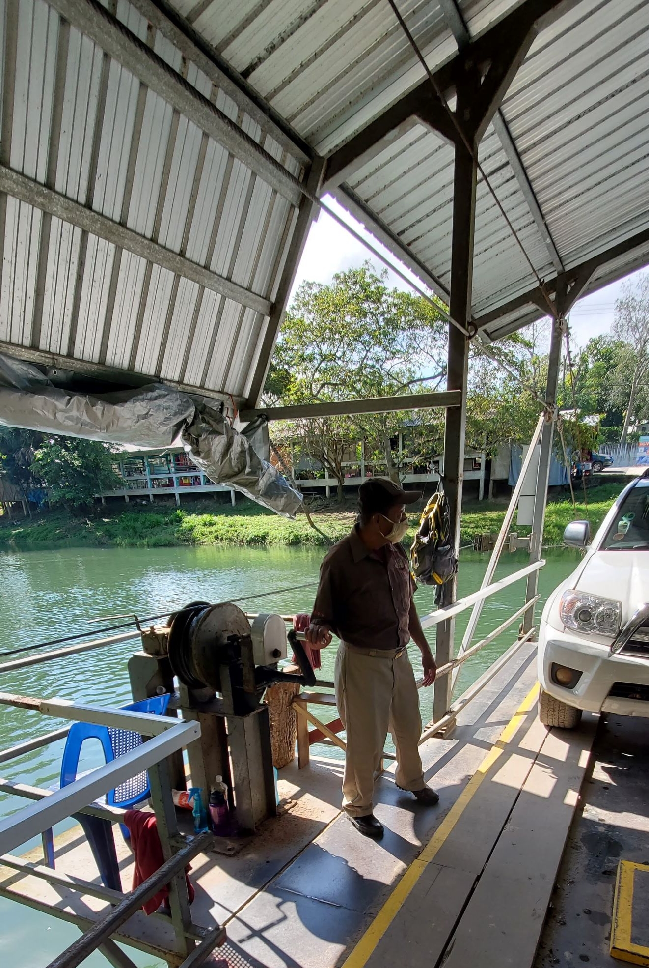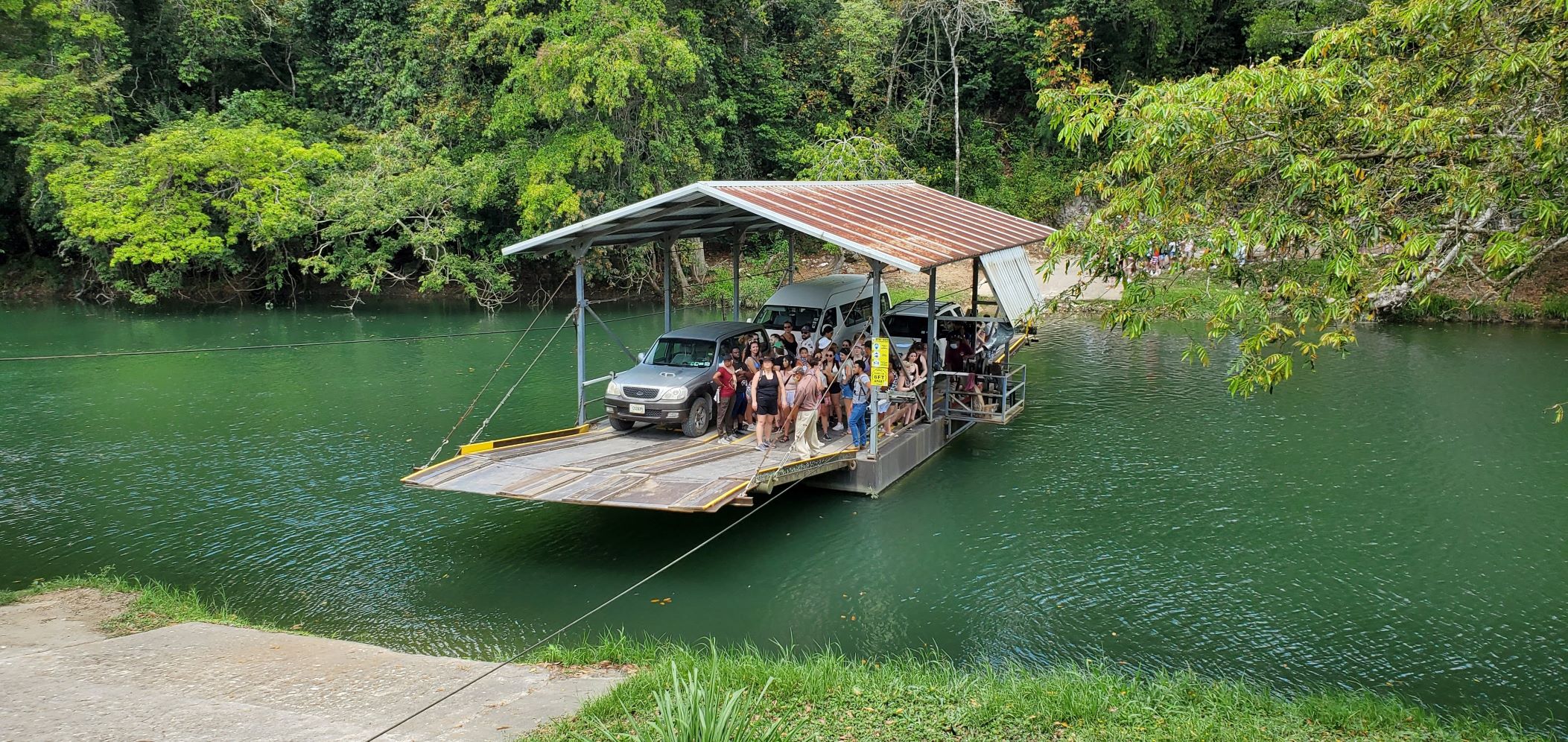 When we arrived, we had to exit his vehicle and walk down to the aforementioned hand-crank ferry for our ride across the Mopan River. Only the drivers can stay in the vehicles – everyone else has to get out for the crossing and then load back up for the drive from the river to the visitor center and museum.