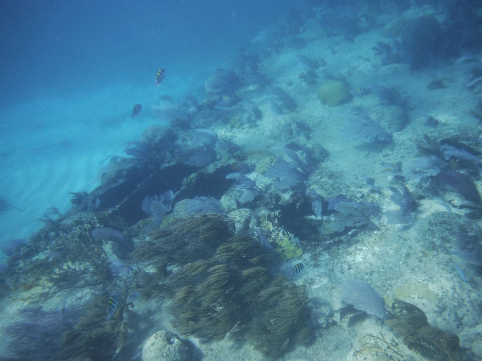 I was getting a bit tired by the time we reached the sunken barge – lots of sun and swimming was wiping me out! – so I tried to just float around the shipwreck, taking in the bright yellow and black striped fish and gobs of my beautiful purple sea fans.