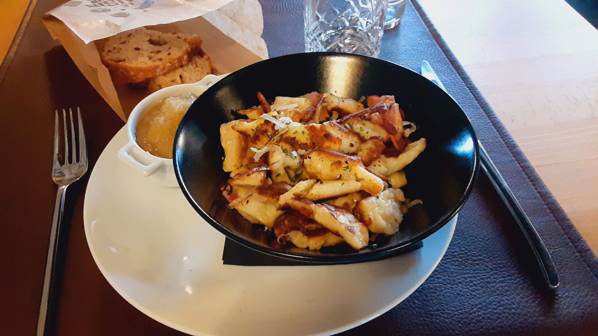 I ordered the kniddelen, which is considered the national dish. Small dense dumplings sautéed with bacon lardons = to die for. The bread and baked apples that accompanied the dish were also delicious.