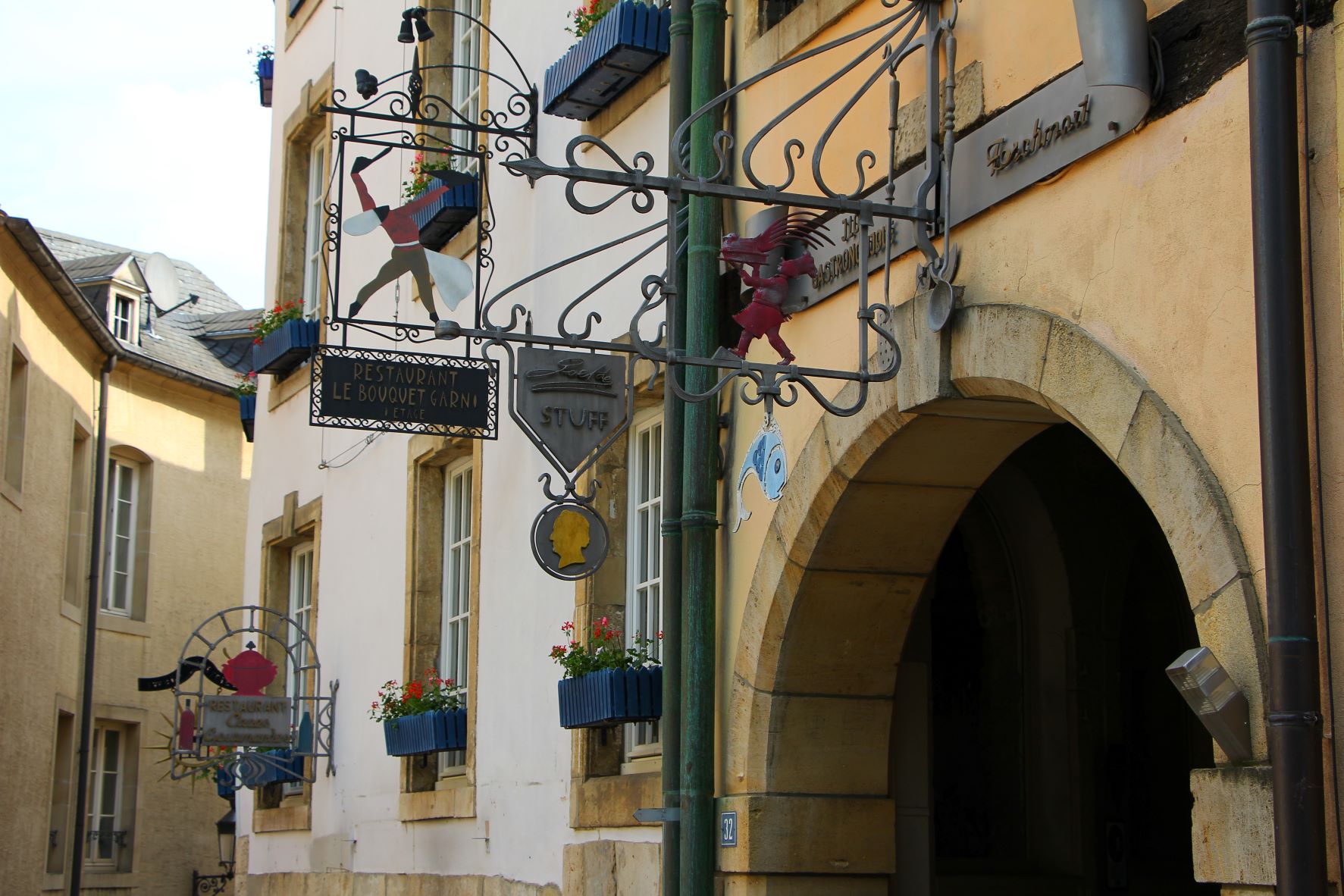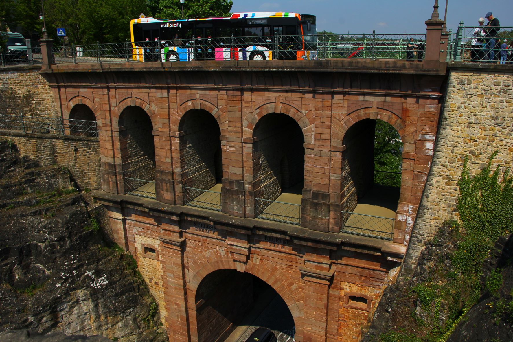 The bridge was constructed between 1900-1903 and had the largest arch stone at that time. The Place de la Constitution, with its multiple tiers of flower-lined walkways and colorful flags, is home to a memorial that was erected in 1923 to honor Luxembourgish soldiers who died in WWI.