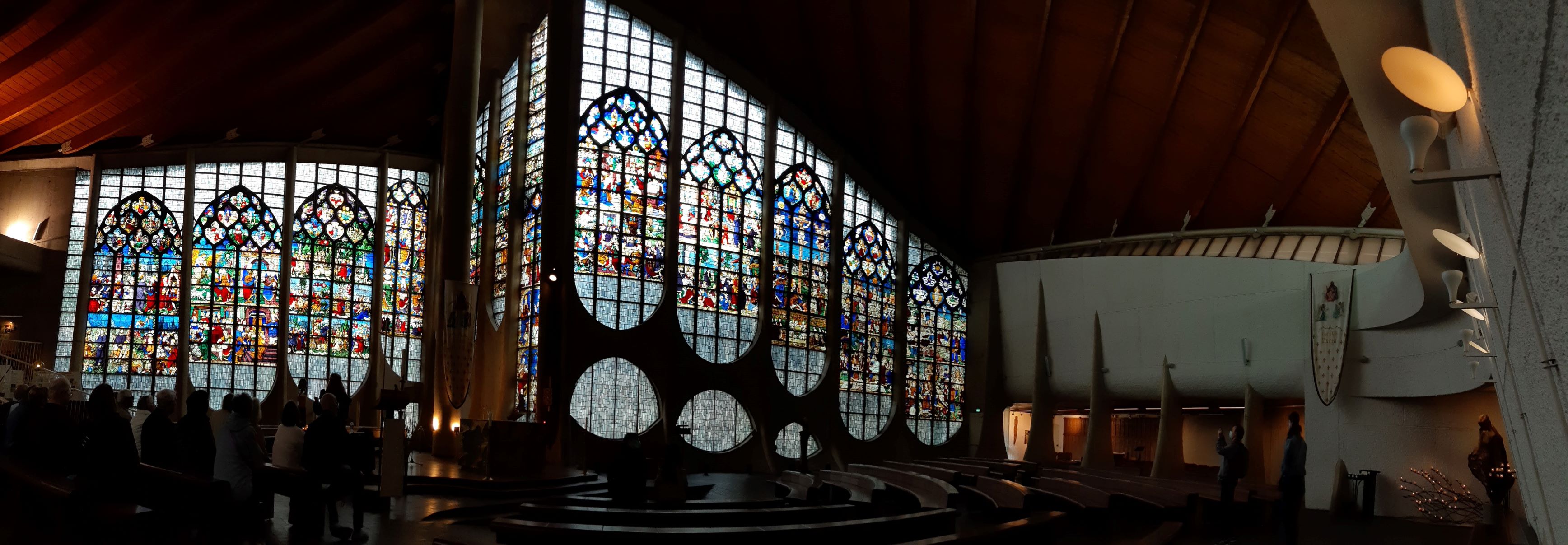These pictures of the inside of the church simply don’t do it justice – it was incredible. Very simple and clean lines, lots of bright wood, and an entire wall of floor to ceiling stained glass windows.