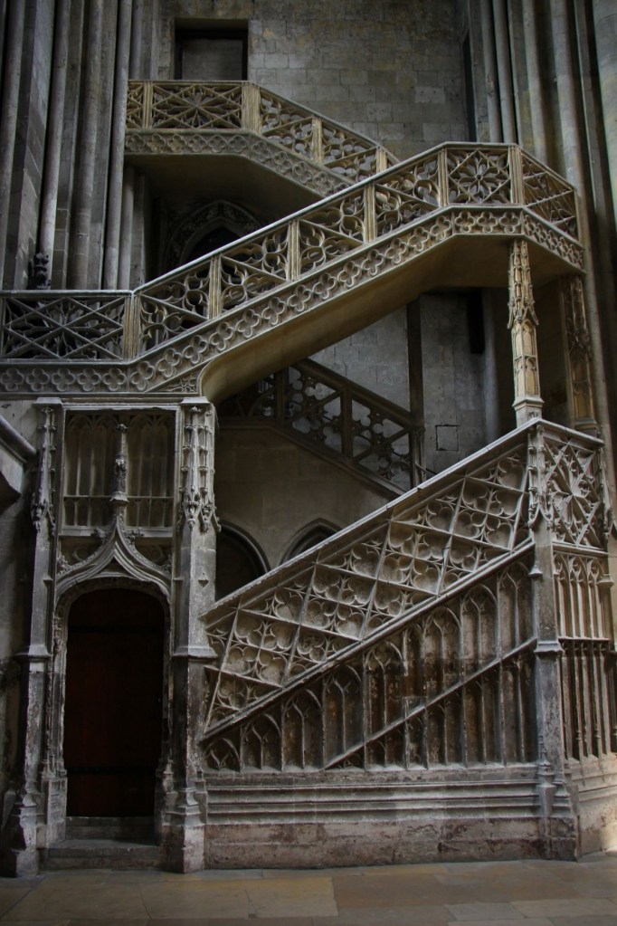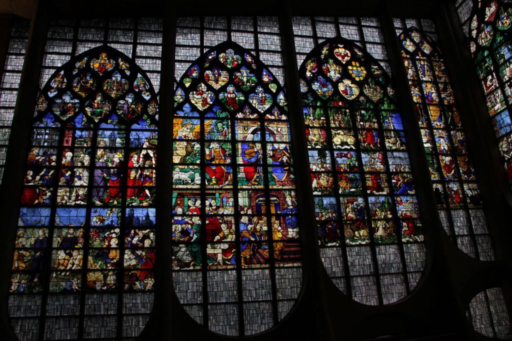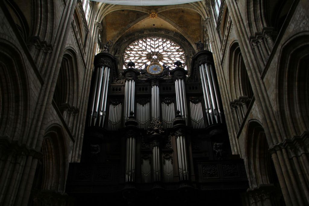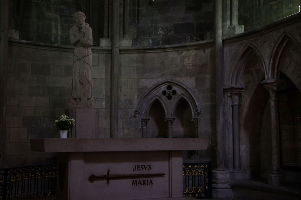 The interior was similarly impressive with a four-story ached arcade leading to the nave, carved stairwells, a massive pipe organ, and various stone alcoves each dedicated to a different saint. I found the one honoring Joan – one of the stained glass windows overlooking a carved statue of her burning features a rendering of her capture.