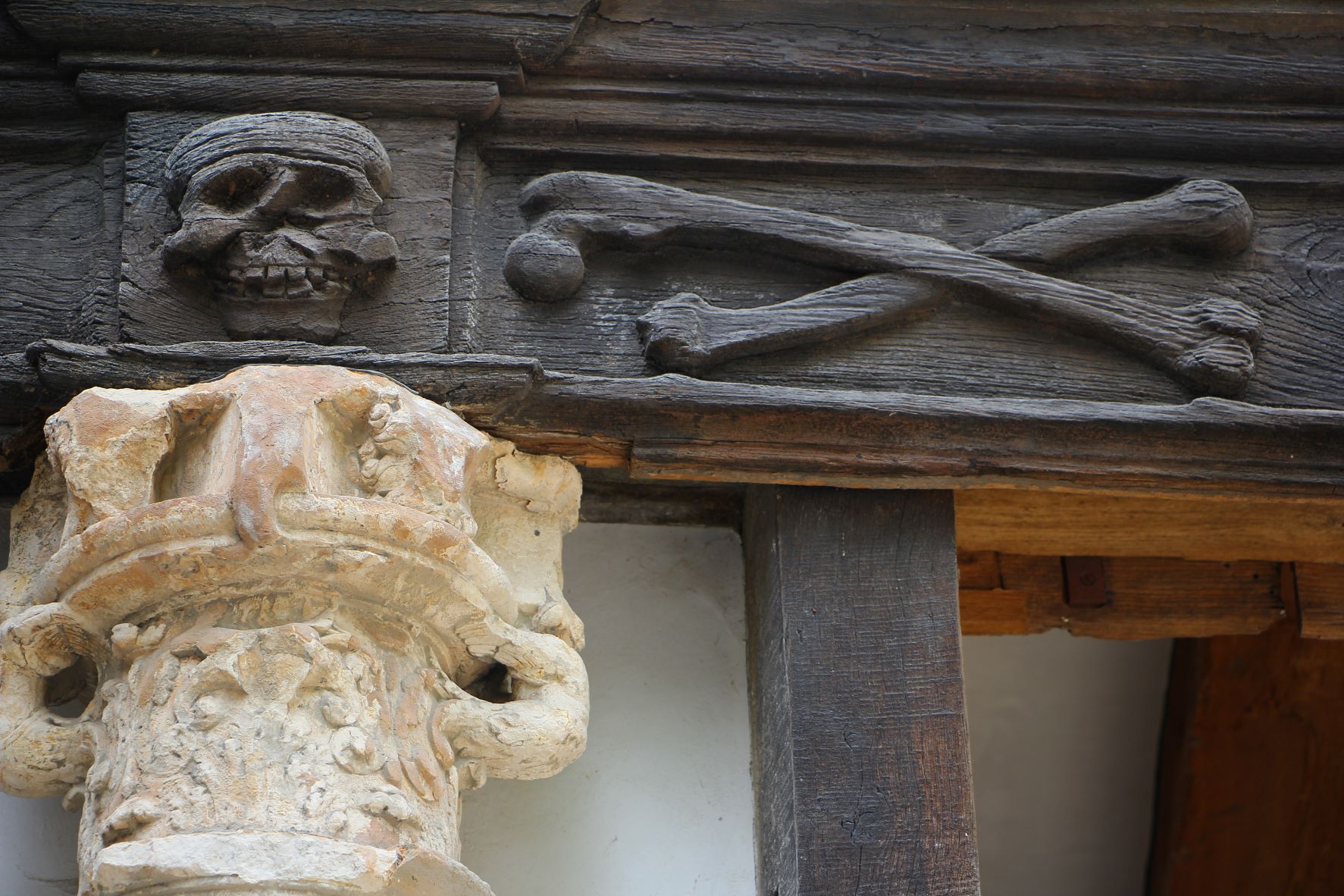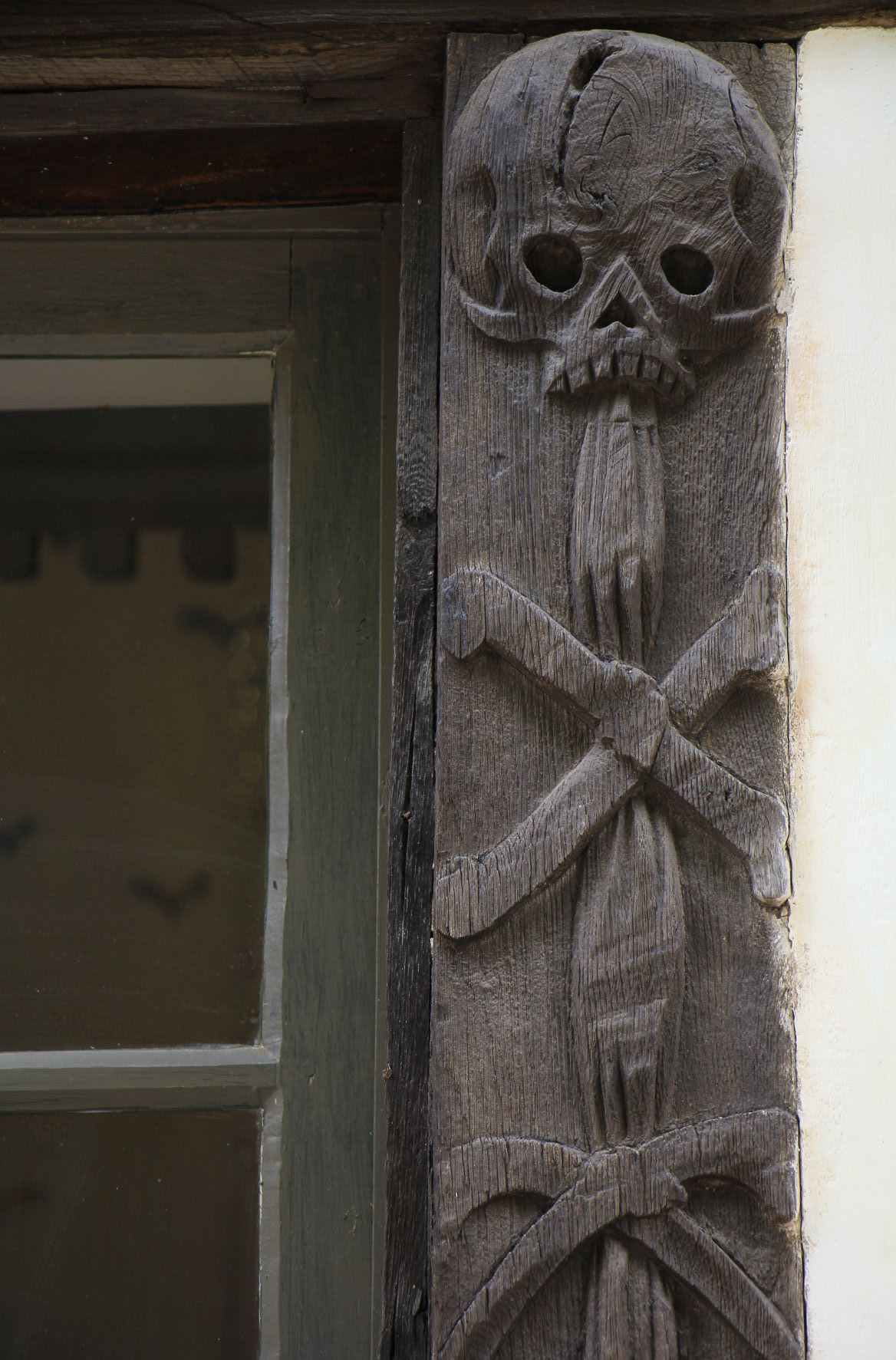 The courtyard itself is not much to look at today – if I hadn’t know what I was looking for, I would have walked on by. My self-guided tour was very helpful and directed me to the more intricate details of the buildings around the square that recall it’s past life – skulls, crossbones, gravedigger tools, and other cryptic carvings adorn the half-timbered walls!