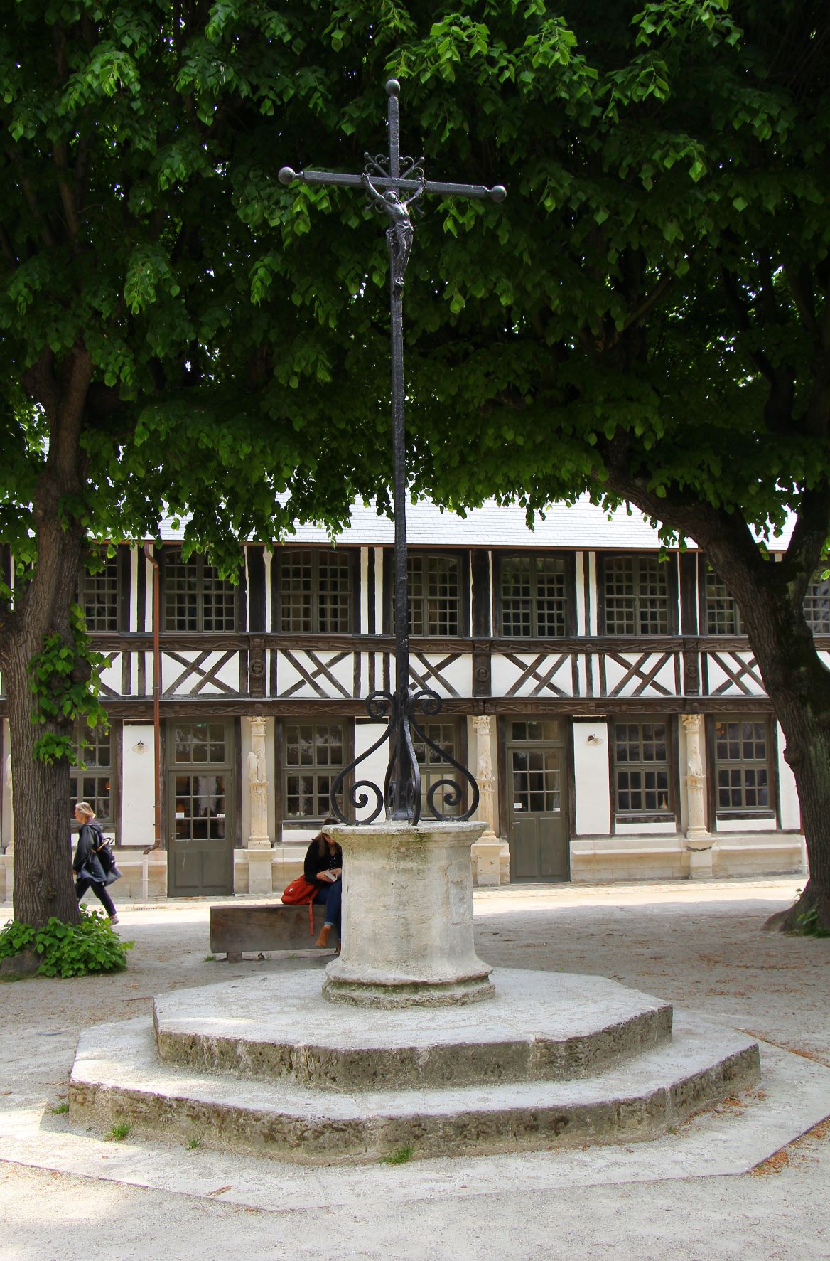 My final stop was Aitre St. Maclou, the plague cemetery that is now a small courtyard park. During the Middle Ages, two-thirds of the community died and were buried here in a mass grave. I had to really look for the alleyway leading me to this spot and lucked into a tour group that had just turned off the main road, catching my attention and helping me find my way!