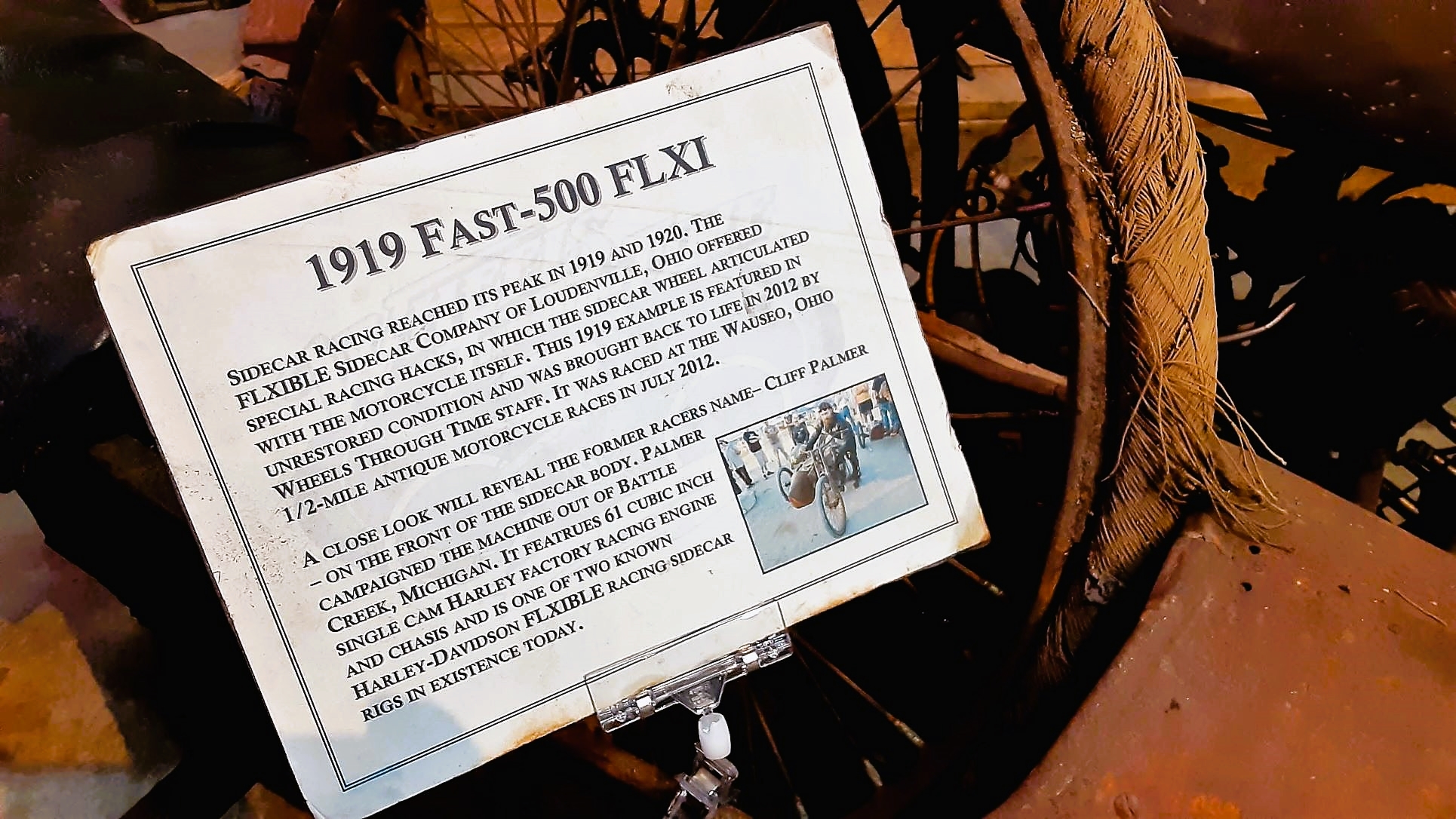 Sidecar racing reached its peak in 1919 and 1920. The FLXIBLE sidecar company of Loudonville, OH offered special racing hacks, in which the sidecar wheel articulated with the motorcycle itself.