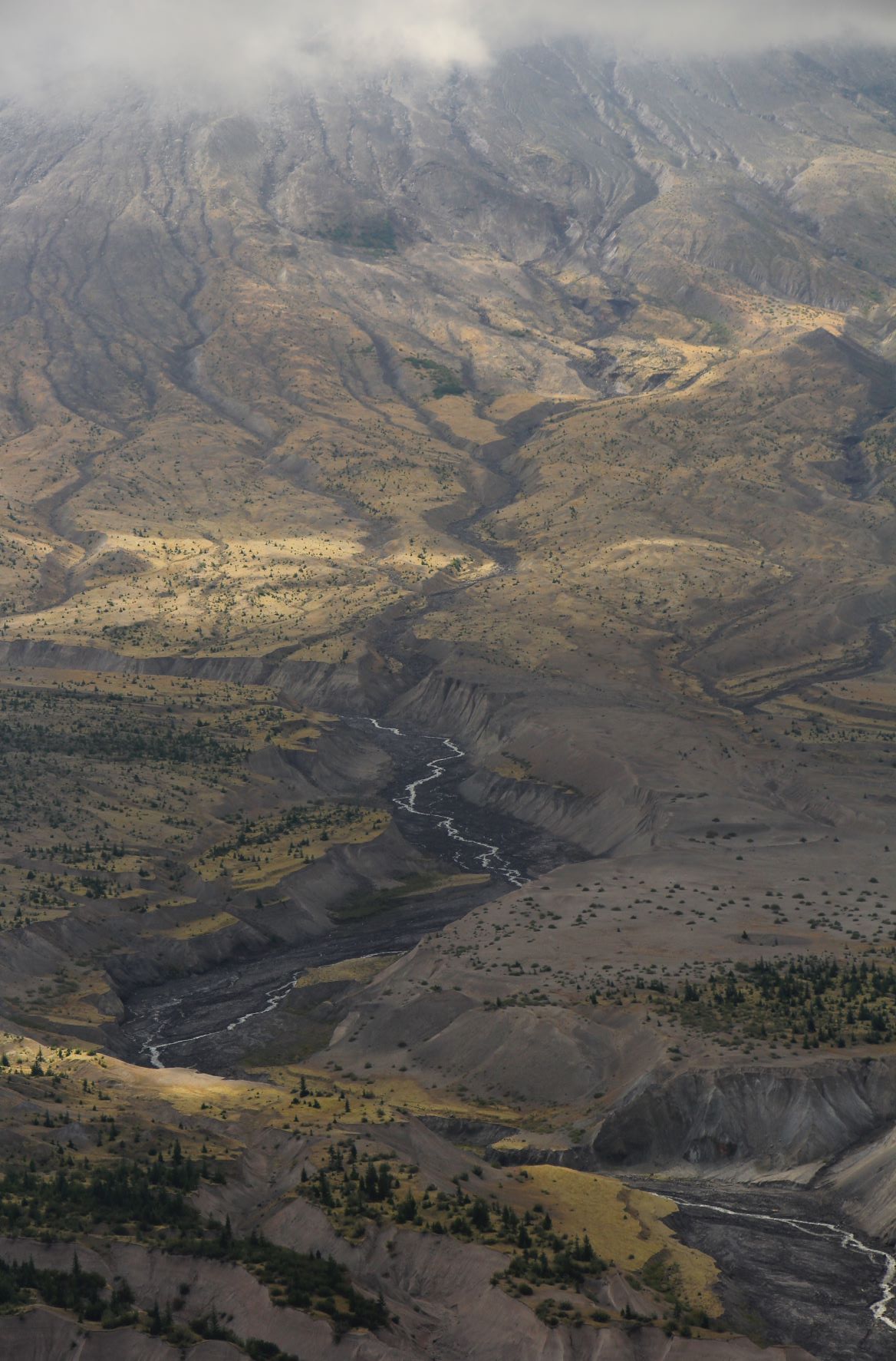 Along the hike, we had amazing views of the lower three-quarters of the volcano and the barren and gouged landscape along its northern side. Occasionally we caught a glimpse of the Crater Glacier near the peak, but more often we could make out the melt carving paths along the mountain side.