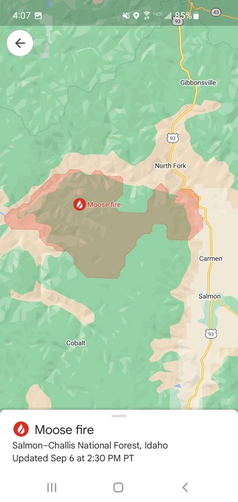 Of greatest concern was the Moose fire pictured below, which was uncomfortably close to route 93 – our main thoroughfare. We looked at whether we could reroute, but it would have significantly impacted our plans. We would have been at risk of not making it to Idaho Falls, where we were scheduled to stay that night, and it would have increased our mileage that day and the next, which sounded exhausting, especially given the triple-digit temperatures in the afternoon.