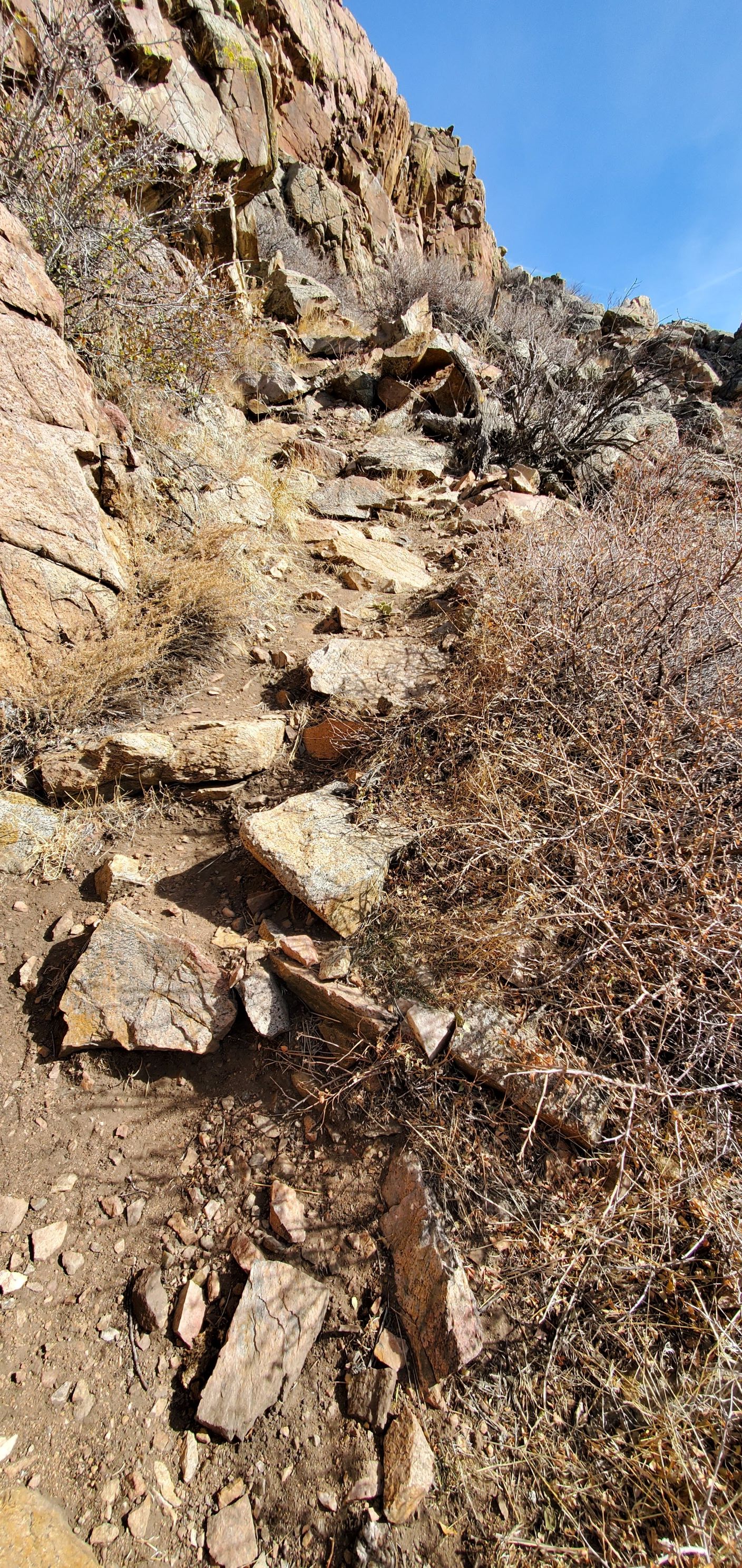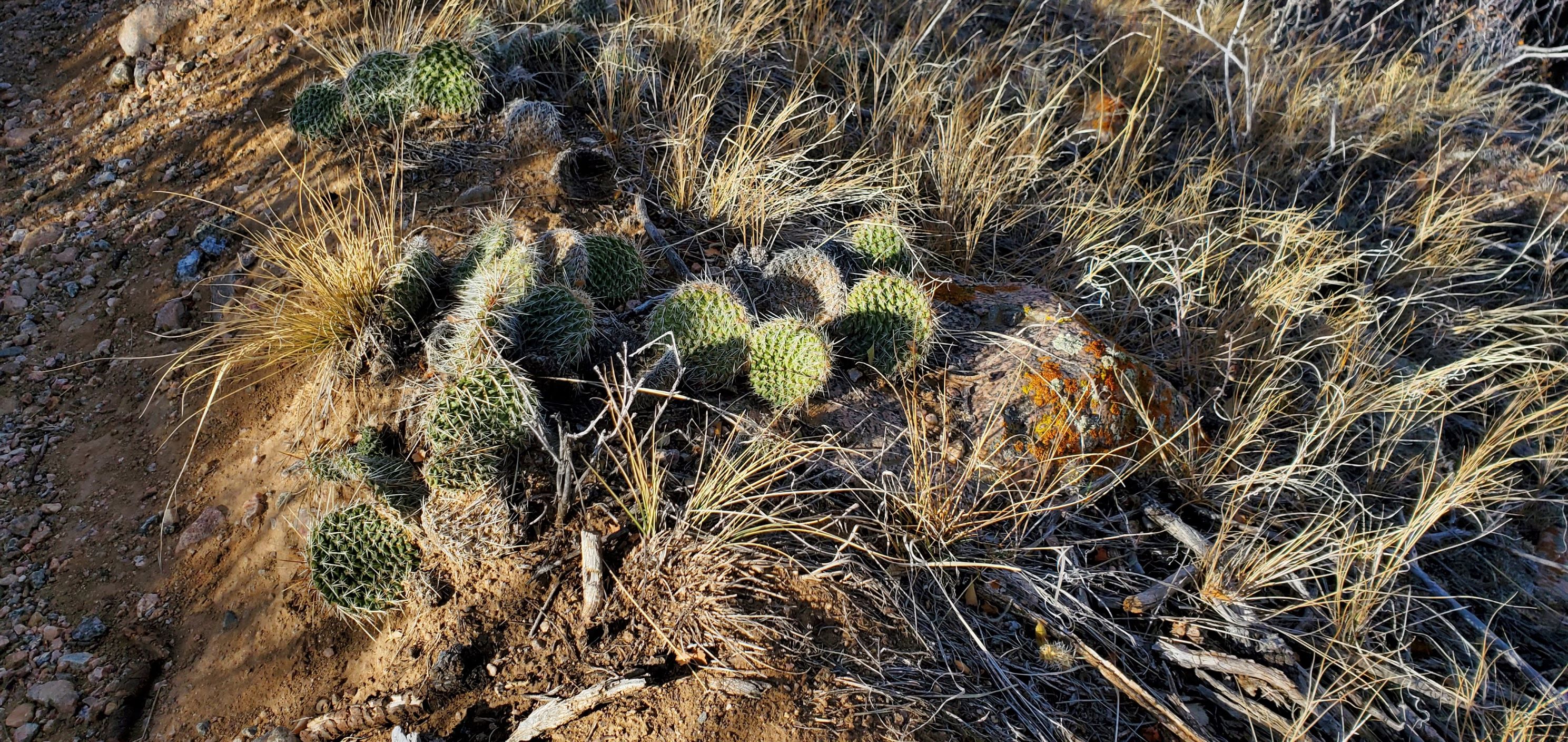 The Highline loop took us out and around one of the hills that runs along the old river gorge leading up to the dam. We had amazing views south and west, and as we circled around to the north the left side of the trail dropped off into the gorge and became rocky and snow-covered in small shady sections. I couldn’t believe all of the cacti at this elevation (~7,000 feet) – Brian described it well as ‘ground cover’ in many areas. Cacti were everywhere!