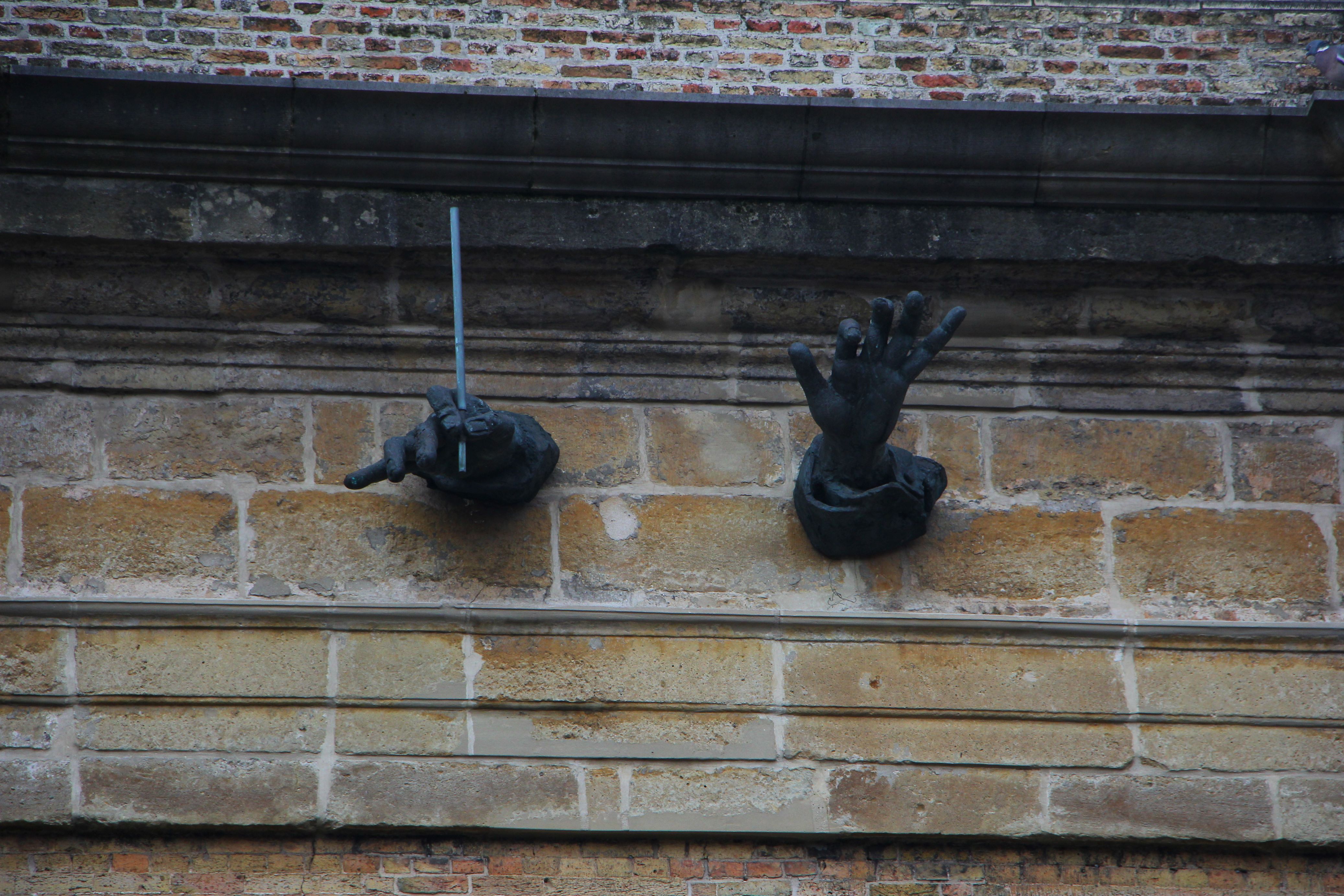 A couple points of interest we encountered along the way included the imposing brick school pictured below as well as an orchestra house that had a fascinating set of conductor hands protruding above its entryway.