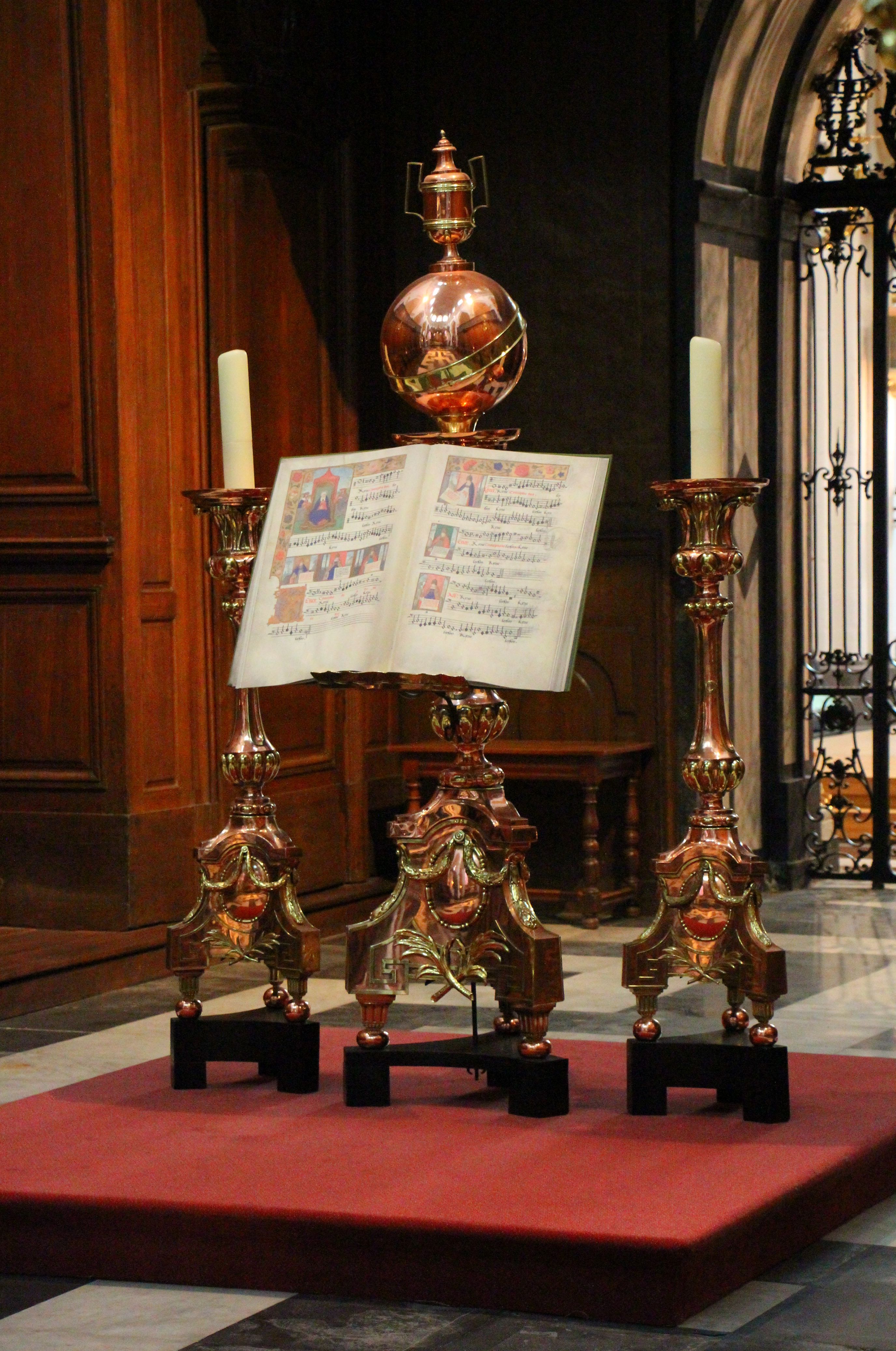 After entering, we wound up several flights of stone stairs to the interior entry, passing a paid-entry museum to the right. We waited in line with many others to enter the side nave to see the phial reputedly containing Christ’s blood. Individuals can climb up a few steps to a viewing platform and then take their time examining the phial before giving an optional donation and being handed a flyer with information. The phial is said to have been brought back to Bruges from the Crusades in the 12th century.