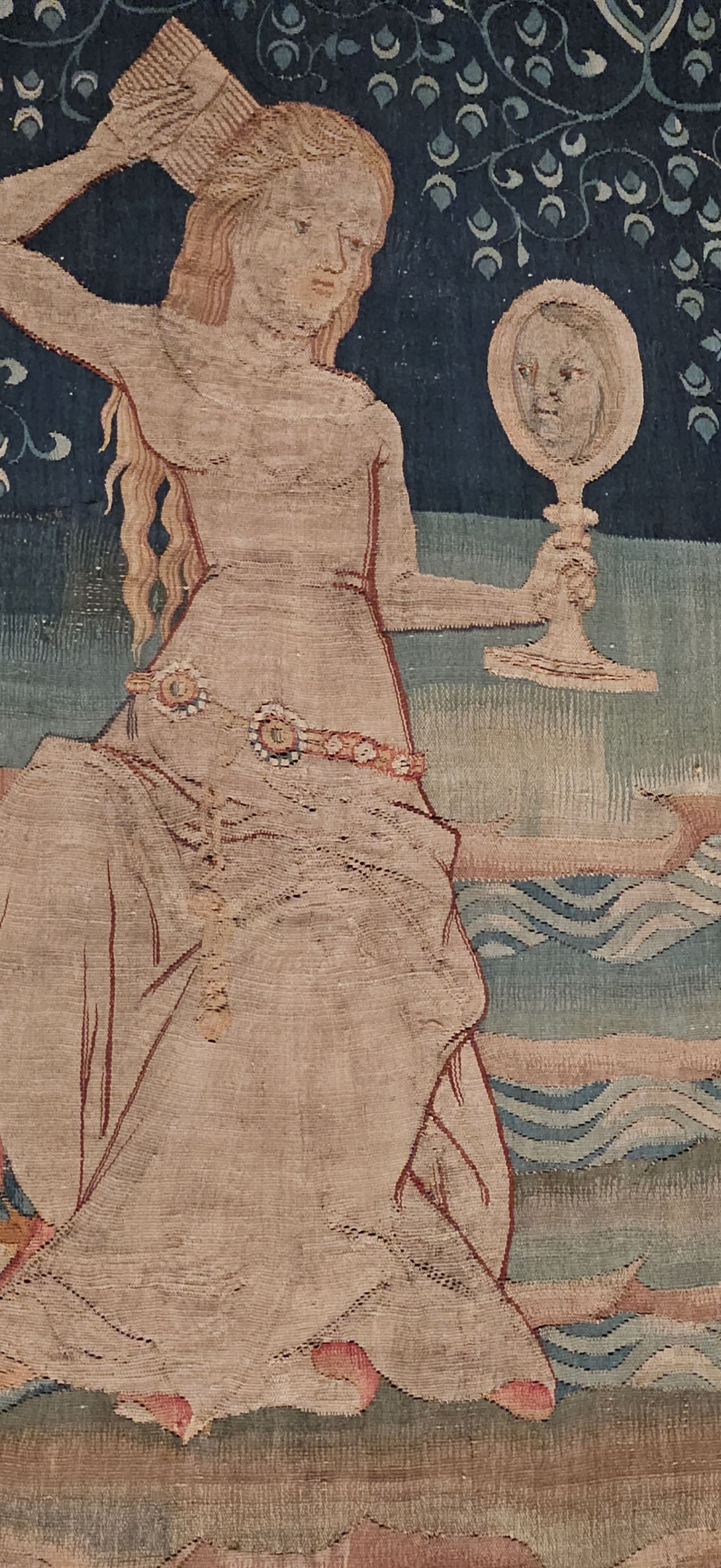 This massive tapestry hangs in an L-shaped gallery at Angers Castle. A couple of my photos below show the two sides of the L – the tapestry wraps around and seems to go on forever.
